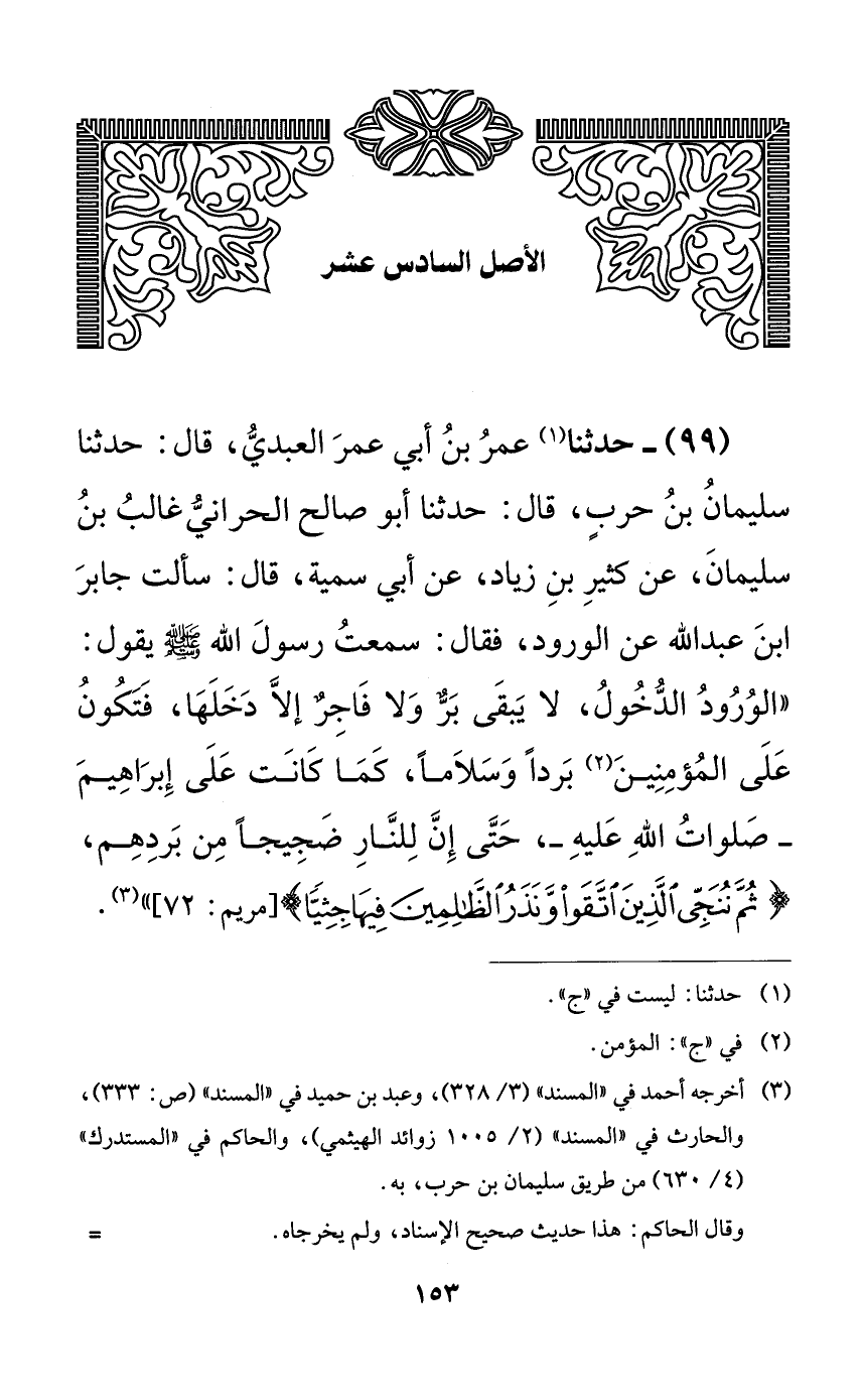 99 - حدثنا عمر بن أبي عمر العبدي، قال: حدثنا سليمان بن حربٍ، قال: حدثنا أبو صالح الحراني غالب بن سليمان، عن كثير بن زياد، عن أبي سمية، قال: سألت جابر ابن عبد الله عن الورود، فقال: سمعت رسول الله صلى الله عليه وسلم يقول: ((الورود الدخول، لا يبقى برٌّ ولا فاجرٌ إلا دخلها، فتكون على المؤمنين برداً وسلاماً، كما كانت على إبراهيم -صلوات الله عليه-، حتى إن للنار ضجيجاً من بردهم، {ثم ننجي الذين اتقوا ونذر الظالمين فيها جثيًّا}.