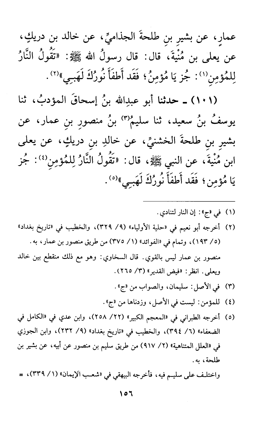 101 - حدثنا أبو عبد الله بن إسحاق المؤدب، ثنا يوسف بن سعيد، ثنا سليم بن منصور بن عمار، عن بشير بن طلحة الخشني، عن خالد بن دريكٍ، عن يعلى ابن منية، عن النبي صلى الله عليه وسلم، قال: ((تقول النار للمؤمن: جز يا مؤمن؛ فقد أطفأ نورك لهبي)).