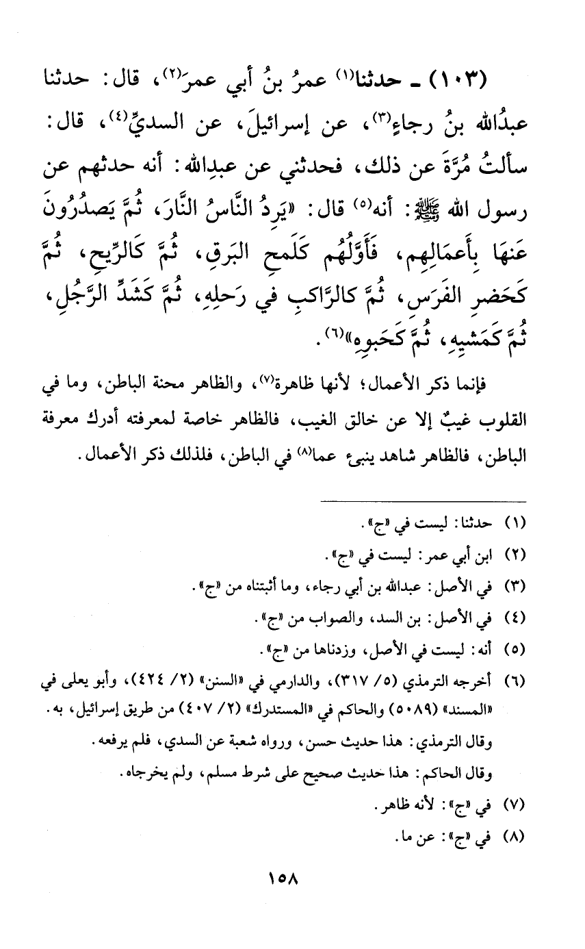 103 - حدثنا عمر بن أبي عمر، قال: حدثنا عبد الله بن رجاءٍ، عن إسرائيل، عن السدي، قال: سألت مرة عن ذلك، فحدثني عن عبد الله: أنه حدثهم عن رسول الله صلى الله عليه وسلم: أنه قال: ((يرد الناس النار، ثم يصدرون عنها بأعمالهم، فأولهم كلمح البرق، ثم كالريح، ثم كحضر الفرس، ثم كالراكب في رحله، ثم كشد الرجل، ثم كمشيه، ثم كحبوه)).