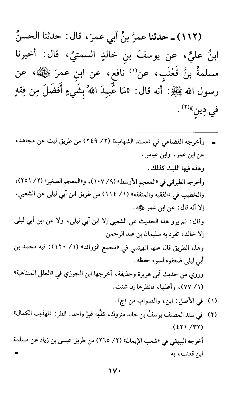 112 - حدثنا عمر بن أبي عمر، قال: حدثنا الحسن ابن عليٍّ، عن يوسف بن خالدٍ السمتي، قال: أخبرنا مسلمة بن قعنبٍ، عن نافعٍ، عن ابن عمر رضي الله عنهما، عن رسول الله صلى الله عليه وسلم: أنه قال: ((ما عبد الله بشيءٍ أفضل من فقه في دينٍ)).