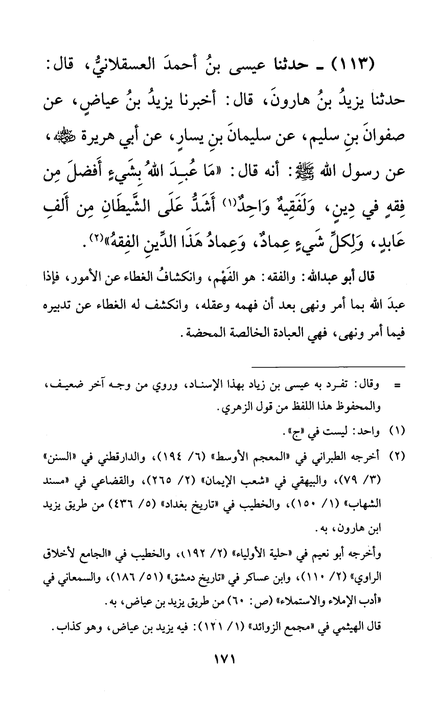 113 - حدثنا عيسى بن أحمد العسقلاني، قال: حدثنا يزيد بن هارون، قال: أخبرنا يزيد بن عياض، عن صفوان بن سليم، عن سليمان بن يسار، عن أبي هريرة رضي الله عنه، عن رسول الله صلى الله عليه وسلم: أنه قال: ((ما عبد الله بشيءٍ أفضل من فقهٍ في دينٍ، ولفقيهٌ واحدٌ أشد على الشيطان من ألف عابدٍ، ولكل شيءٍ عمادٌ، وعماد هذا الدين الفقه)).