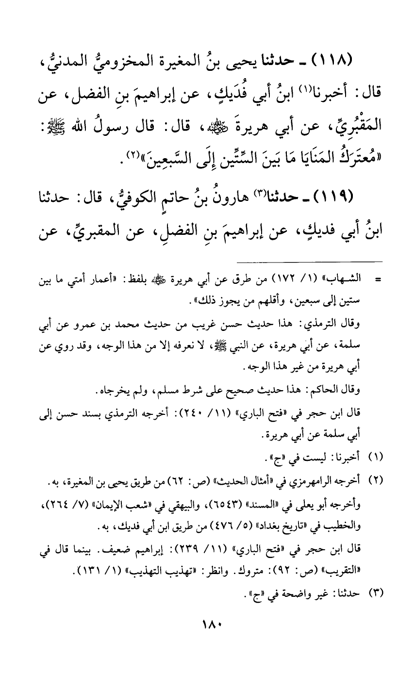 118 - حدثنا يحيى بن المغيرة المخزومي المدني، قال: أخبرنا ابن أبي فديك، عن إبراهيم بن الفضل، عن المقبري، عن أبي هريرة رضي الله عنه، قال: قال رسول الله صلى الله عليه وسلم: ((معترك المنايا ما بين الستين إلى السبعين)).