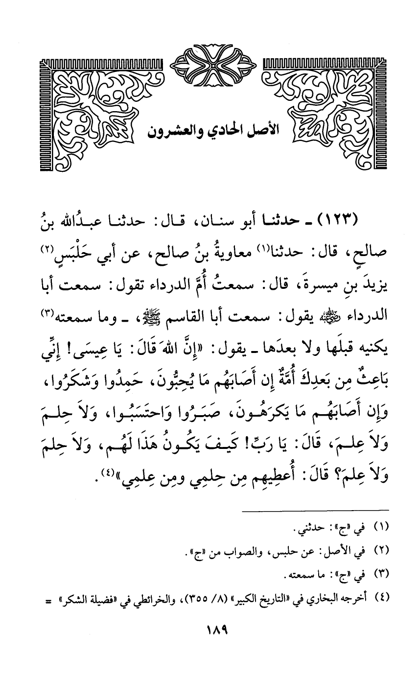 123 - حدثنا أبو سنان، قال: حدثنا عبد الله بن صالحٍ، قال: حدثنا معاوية بن صالح، عن أبي حلبسٍ يزيد بن ميسرة، قال: سمعت أم الدرداء تقول: سمعت أبا الدرداء رضي الله عنه يقول: سمعت أبا القاسم صلى الله عليه وسلم، -وما سمعته يكنيه قبلها ولا بعدها- يقول: ((إن الله قال: يا عيسى! إني باعثٌ من بعدك أمةٌ إن أصابهم ما يحبون، حمدوا وشكروا، وإن أصابهم ما يكرهون، صبروا واحتسبوا، ولا حلم ولا علم، قال: يا رب! كيف يكون هذا لهم، ولا حلم ولا علم؟ قال: أعطيهم من حلمي ومن علمي)).