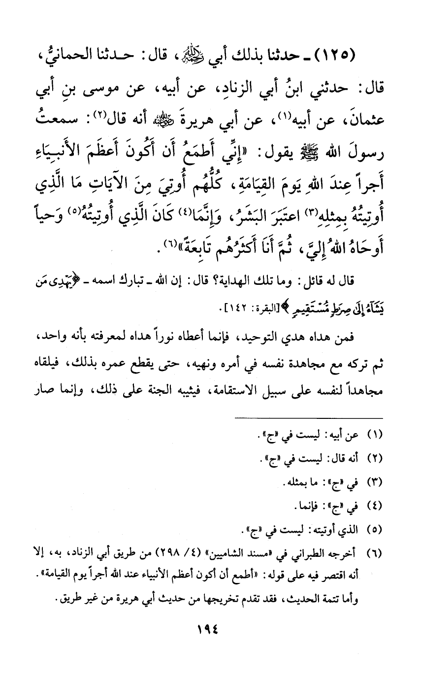 125 - حدثنا بذلك أبي رحمه الله، قال: حدثنا الحماني، قال: حدثني ابن أبي الزناد، عن أبيه، عن موسى بن أبي عثمان، عن أبيه، عن أبي هريرة رضي الله عنه أنه قال: سمعت رسول الله صلى الله عليه وسلم يقول: ((إني أطمع أن أكون أعظم الأنبياء أجراً عند الله يوم القيامة، كلهم أوتي من الآيات ما الذي أوتيته بمثله اعتبر البشر، وإنما كان الذي أوتيته وحياً أوحاه الله إلي، ثم أنا أكثرهم تابعةً)).