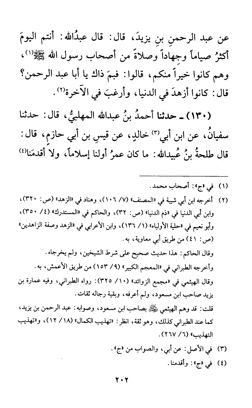 130 - حدثنا أحمد بن عبد الله المهلبي، قال: حدثنا سفيان، عن ابن أبي خالدٍ، عن قيس بن أبي حازمٍ، قال: قال طلحة بن عبيد الله: ما كان عمر أولنا إسلاماً، ولا أقدمنا
