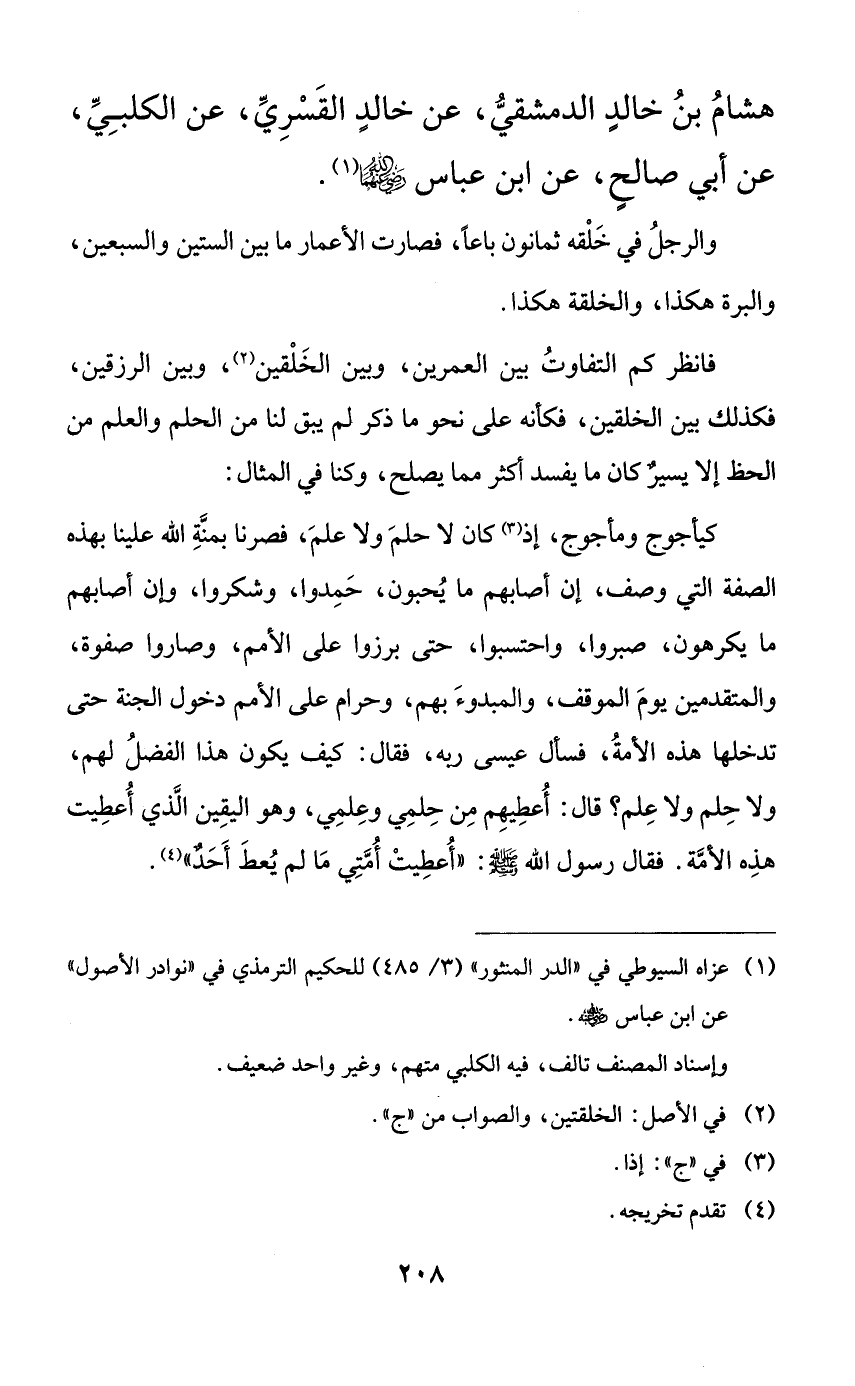 كيأجوج ومأجوج، إذ كان لا حلم ولا علم، فصرنا بمنة الله علينا بهذه الصفة التي وصف، إن أصابهم ما يحبون، حمدوا، وشكروا، وإن أصابهم ما يكرهون، صبروا، واحتسبوا، حتى برزوا على الأمم، وصاروا صفوة، والمتقدمين يوم الموقف، والمبدوء بهم، وحرام على الأمم دخول الجنة حتى تدخلها هذه الأمة، فسأل عيسى ربه، فقال: كيف يكون هذا الفضل لهم، ولا حلم ولا علم؟ قال: أعطيهم من حلمي وعلمي، وهو اليقين الذي أعطيت هذه الأمة. فقال رسول الله صلى الله عليه وسلم: ((أعطيت أمتي ما لم يعط أحدٌ)).