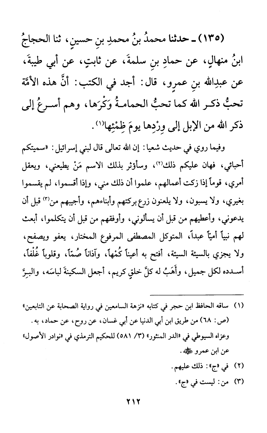135 - حدثنا محمد بن محمد بن حسينٍ، ثنا الحجاج ابن منهالٍ، عن حماد بن سلمة، عن ثابتٍ، عن أبي طيبة، عن عبد الله بن عمرٍو، قال: أجد في الكتب: أن هذه الأمة تحب ذكر الله كما تحب الحمامة وكرها، وهم أسرع إلى ذكر الله من الإبل إلى وردها يوم ظمئها.