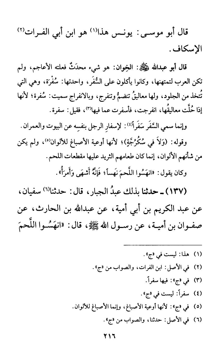 137 - حدثنا بذلك عبد الجبار: قال: حدثنا سفيان، عن عبد الكريم بن أبي أمية، عن عبد الله بن الحارث، عن صفوان بن أمية، عن رسول الله صلى الله عليه وسلم، قال: ((انهسوا اللحم