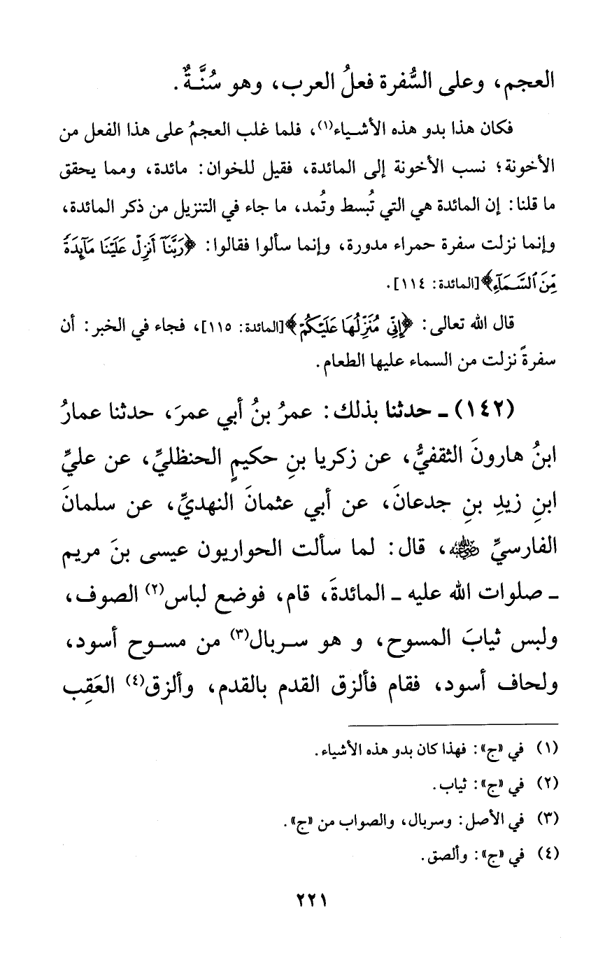 142 - حدثنا بذلك: عمر بن أبي عمر، حدثنا عمار ابن هارون الثقفي، عن زكريا بن حكيمٍ الحنظلي، عن علي ابن زيد بن جدعان، عن أبي عثمان النهدي، عن سلمان الفارسي رضي الله عنه، قال: لما سألت الحواريون عيسى بن مريم -صلوات الله عليه- المائدة، قال: فوضع لباس الصوف، ولبس ثياب المسوح، وهو سربال من مسوح أسود، ولحاف أسود، فقام فألزق القدم بالقدم، وألزق العقب