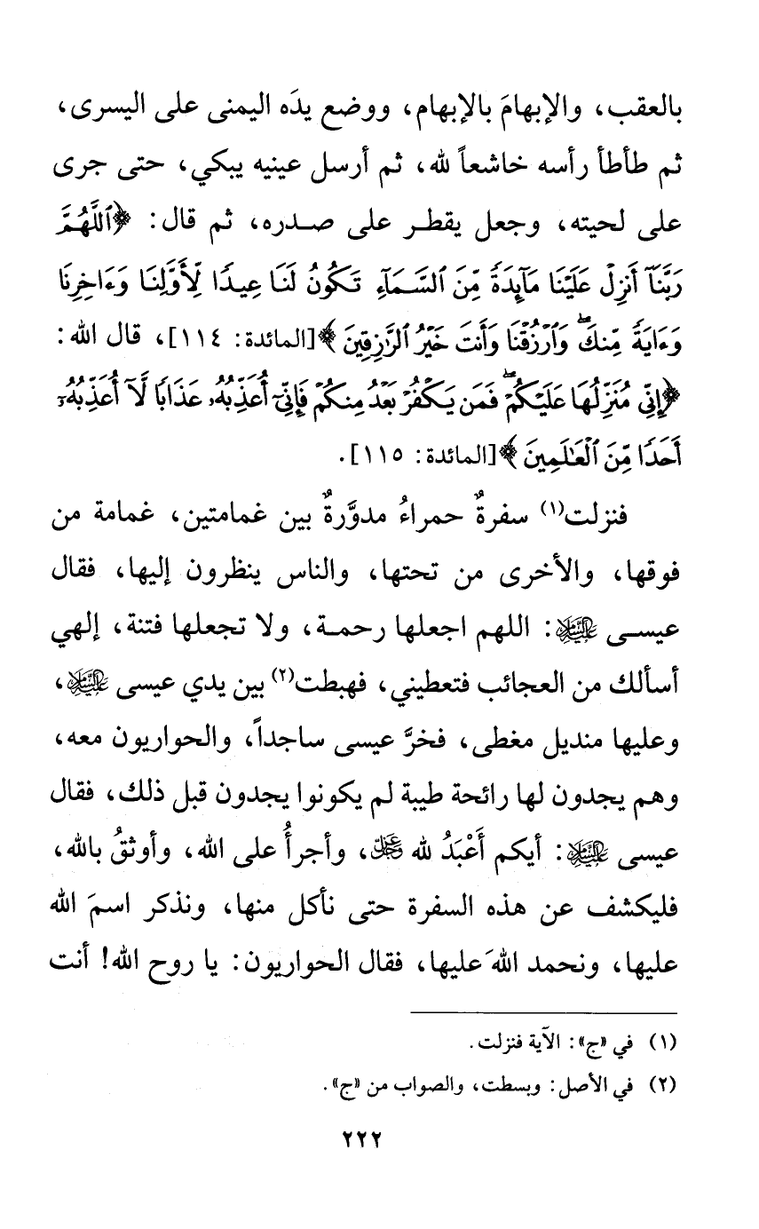بالعقب، والإبهام بالإبهام، ووضع يده اليمنى على اليسرى، ثم طأطأ رأسه خاشعاً لله، ثم أرسل عينيه يبكي، حتى جرى على لحيته، وجعل يقطر على صدره، ثم قال: {اللهم ربنا أنزل علينا مائدةً من السماء تكون لنا عيداً لأولنا وآخرنا وآيةً منك وارزقنا وأنت خير الرازقين}، قال الله: {إني منزلها عليكم فمن يكفر بعد منكم فإني أعذبه عذاباً لا أعذبه أحداً من العالمين}.