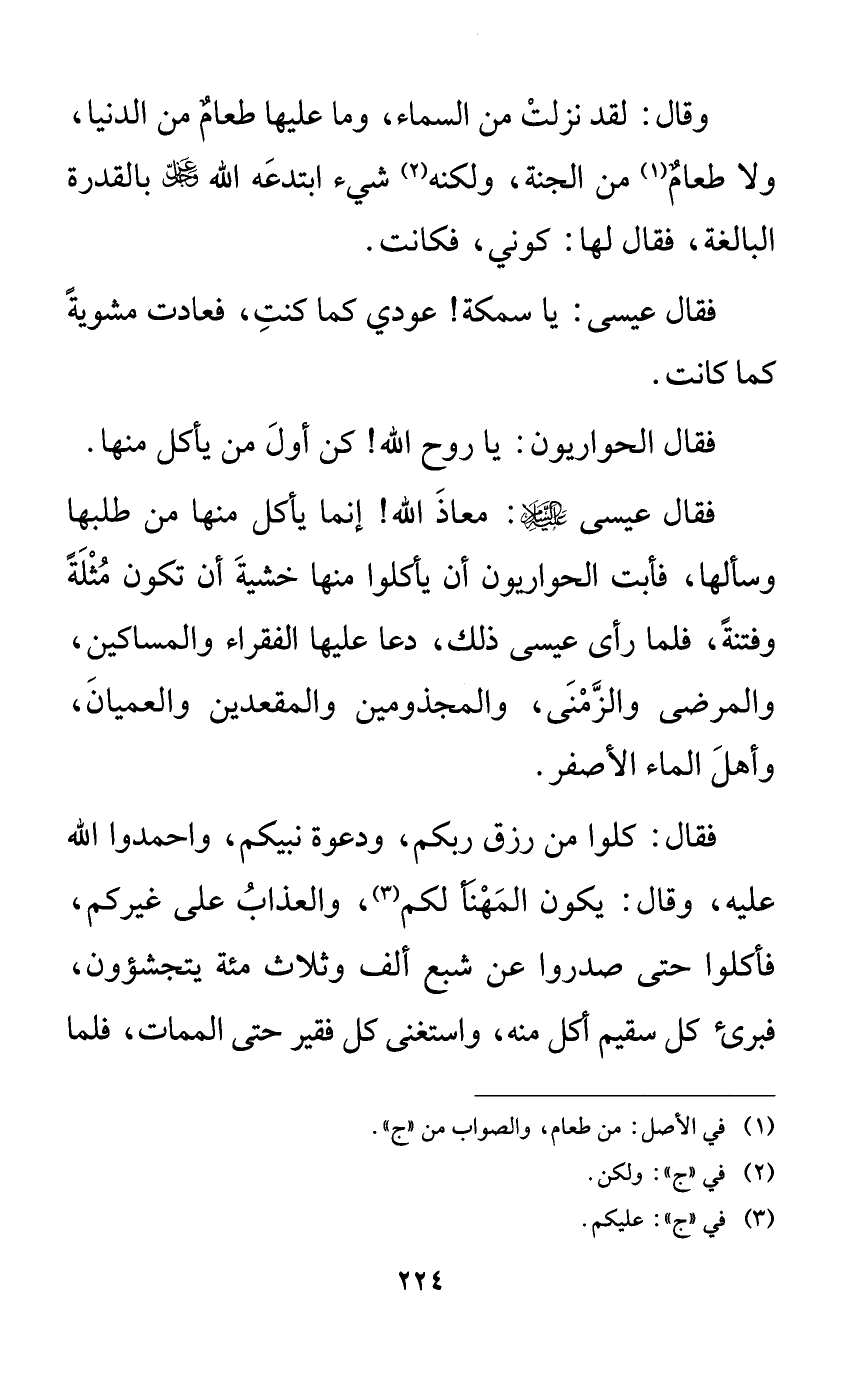 فقال عيسى: يا سمكة! عودي كما كنت، فعادت مشوبةً كما كانت.