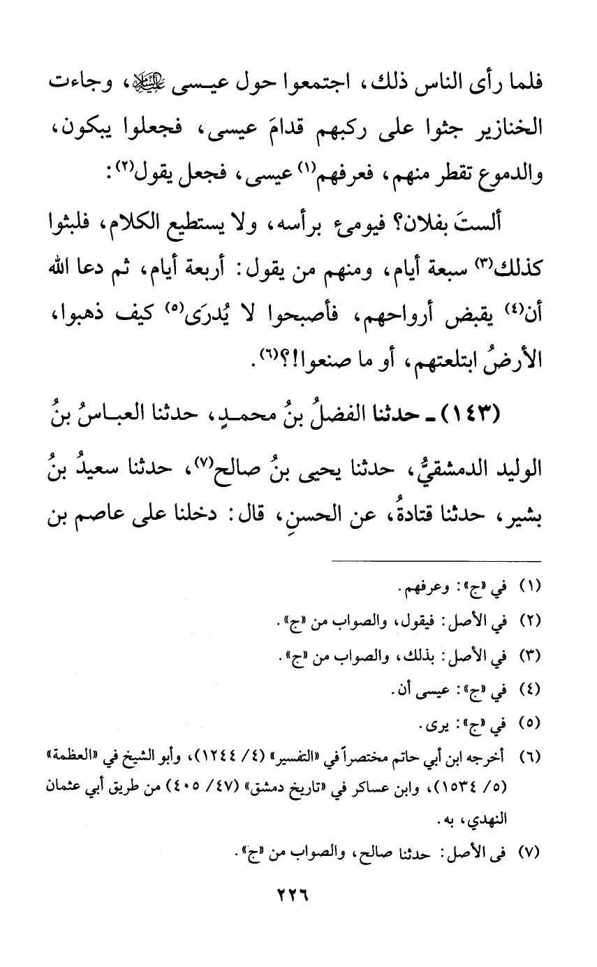 143 - حدثنا الفضل بن محمدٍ، حدثنا العباس بن الوليد الدمشقي، حدثنا يحيى بن صالح، حدثنا سعيد بن بشير، حدثنا قتادة، عن الحسن، قال: دخلنا على عاصم بن