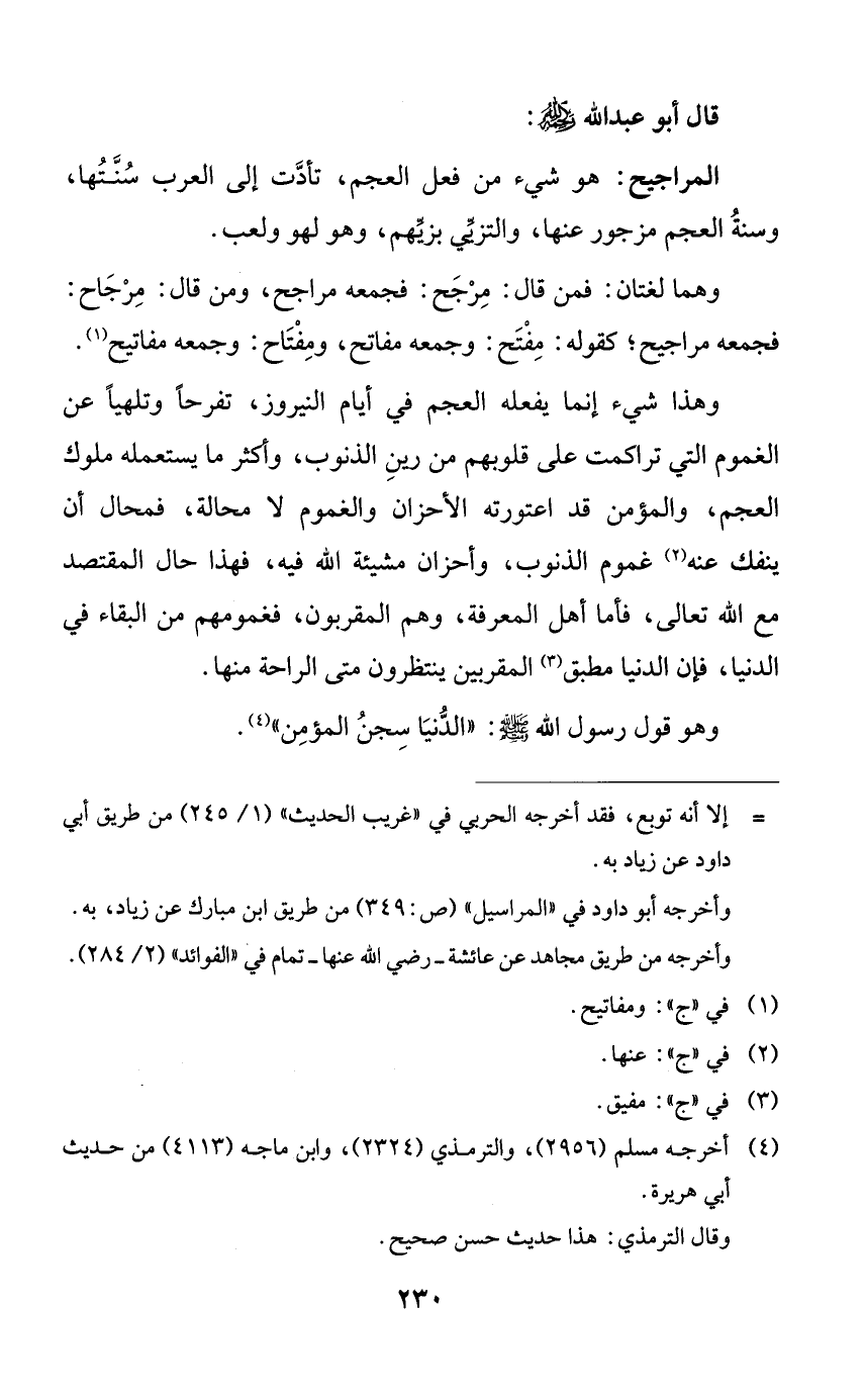 وهذا شيء إنما يفعله العجم في أيام النيروز، تفرحاً وتلهياً عن الغموم التي تراكمت على قلوبهم من رين الذنوب، وأكثر ما يستعمله ملوك العجم، والمؤمن قد اعتورته الأحزان والغموم لا محالة، فمحال أن ينفك عنه غموم الذنوب، وأحزان مشيئة الله فيه، فهذا حال المقتصد مع الله تعالى، فأما أهل المعرفة، وهم المقربون، فغمومهم من البقاء في الدنيا، فإن الدنيا مطبق المقربين ينتظرون متى الراحة منها.