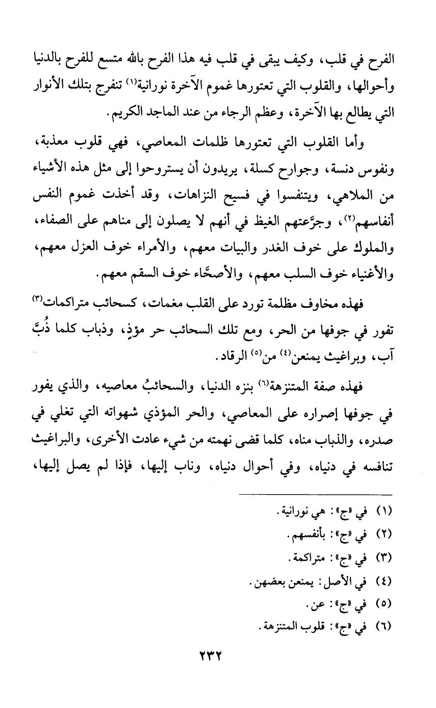 وأما القلوب التي تعتورها ظلمات المعاصي، فهي قلوب معذبة، ونفوس دنسة، وجوارح كسلة، يريدون أن يستروحوا إلى مثل هذه الأشياء من الملاهي، ويتنفسوا في فسيح النزاهات، وقد أخذت غموم النفس أنفاسهم، وجرعتهم الغيظ في أنهم لا يصلون إلى مناهم على الصفاء، والملوك على خوف الغدر والبيات معهم، والأمراء خوف العزل معهم، والأغنياء خوف السلب معهم، والأصحاء خوف السقم معهم.