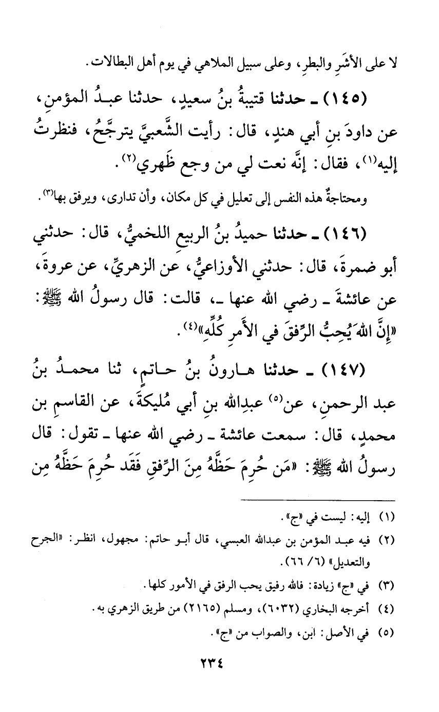 146 - حدثنا حميد بن الربيع اللخمي، قال: حدثني أبو ضمرة، قال: حدثني الأوزاعي، عن الزهري، عن عروة، عن عائشة -رضي الله عنها-، قالت: قال رسول الله صلى الله عليه وسلم: ((إن الله يحب الرفق في الأمر كله)).