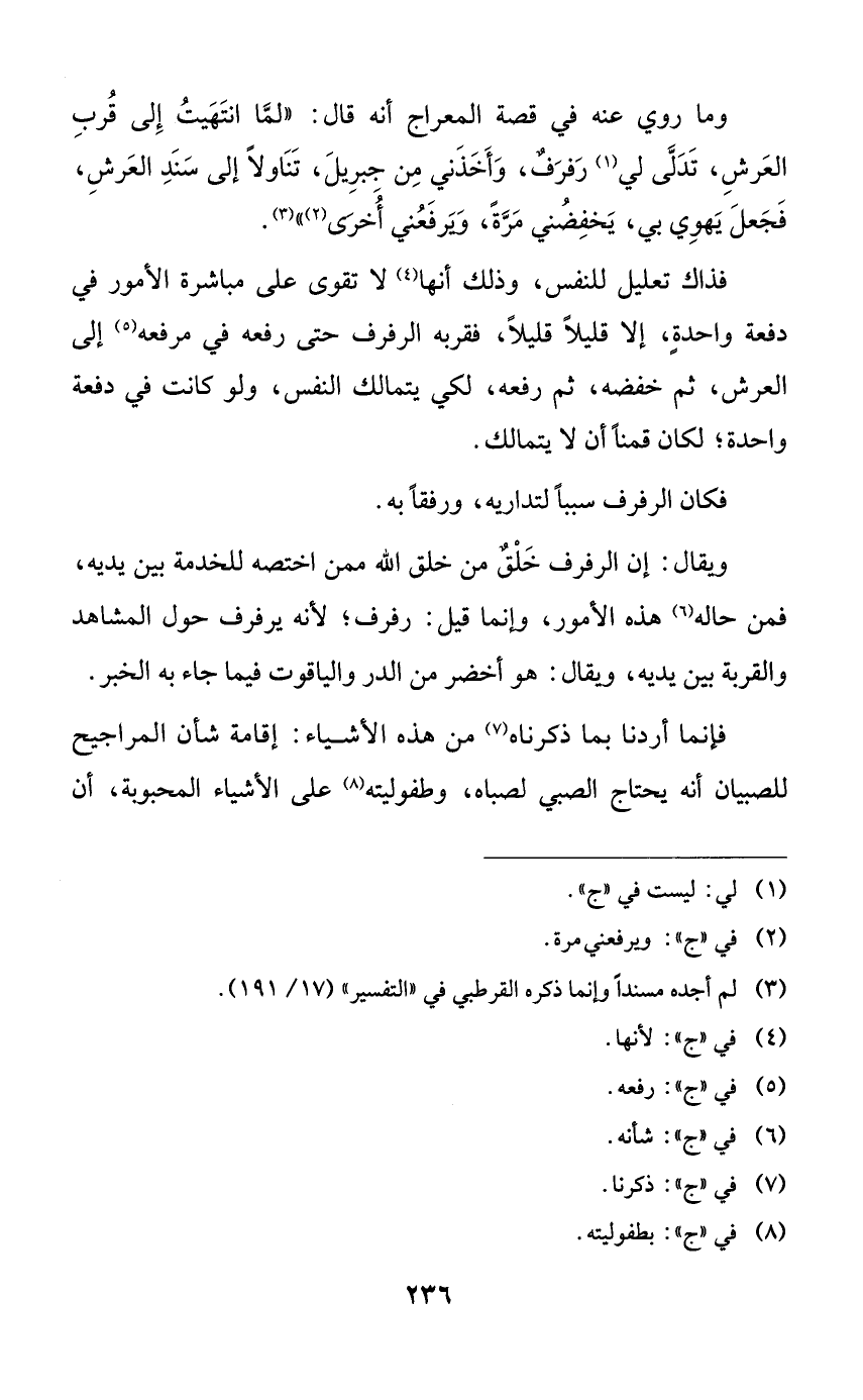 وما روي عنه في قصة المعراج أنه قال: ((لما انتهيت إلى قرب العرش، تدلى لي رفرفٌ، وأخذني من جبريل، تناولاً إلى سند العرش، فجعل يهوي بي، يخفضني مرةً، ويرفعني أخرى)).