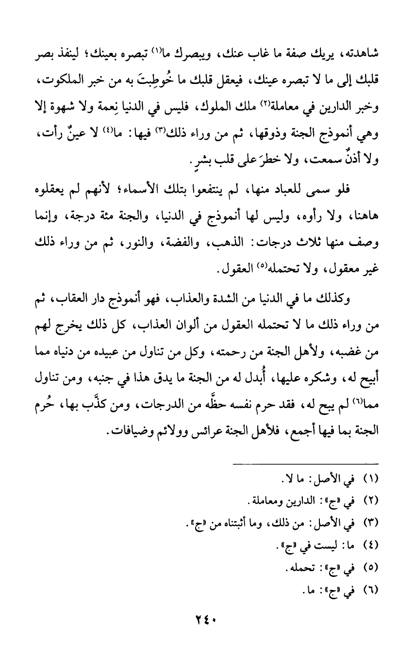 شاهدته، يريك صفة ما غاب عنك، ويبصرك ما تبصره بعينك؛ لينفذ بصر قلبك إلى ما لا تبصره عينك، فيعقل قلبك ما خوطبت به من خبر الملكوت، وخبر الدارين في معاملة ملك الملوك، فليس في الدنيا نعمة ولا شهوة إلا وهي أنموذج الجنة وذوقها، ثم من وراء ذلك فيها: ما لا عينٌ رأيت، ولا أذنٌ سمعت، ولا خطر على قلب بشرٍ.