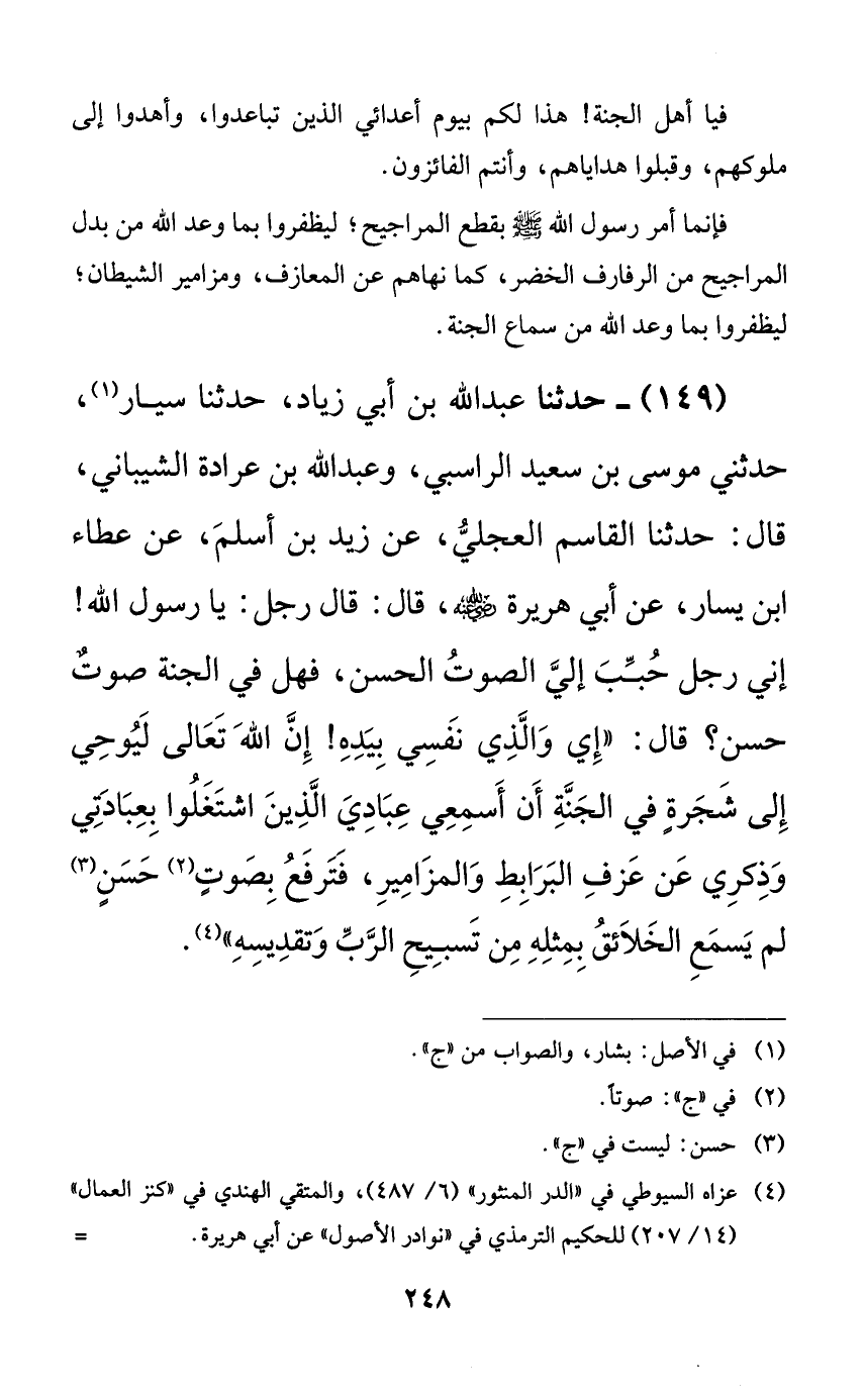 149 - حدثنا عبد الله بن أبي زياد، حدثنا سيار، حدثني موسى بن سعيد الراسبي، وعبد الله بن عرادة الشيباني، قال: حدثنا القاسم العجلي، عن زيد بن أسلم، عن عطاء ابن يسار، عن أبي هريرة رضي الله عنه، قال: قال رجل: يا رسول الله! إني رجل حبب إلي الصوت الحسن، فهل في الجنة صوتٌ حسن؟ قال: ((إي والذي نفسي بيده! إن الله تعالى ليوحي إلى شجرةٍ في الجنة أن أسمعي عبادي الذين اشتغلوا بعبادتي وذكري عن عزف البرابط والمزامير، فترفع بصوتٍ حسنٍ لم يسمع الخلائق بمثله من تسبيح الرب وتقديسه)).