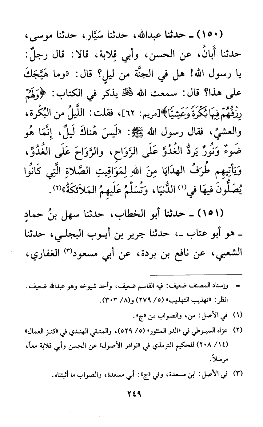 150 - حدثنا عبد الله، حدثنا سيار، حدثنا موسى، حدثنا أبان، عن الحسن، وأبي قلابة، قالا: قال رجلٌ: يا رسول الله! هل في الجنة من ليلٍ؟ قال: ((وما هيجك على هذا؟ قال: سمعت الله عز وجل يذكر في الكتاب: {ولهم رزقهم فيها بكرةً وعشياً}، فقلت: الليل من البكرة، والعشي، فقال رسول الله صلى الله عليه وسلم: ((ليس هناك ليلٌ، إنما هو ضوءٌ ونورٌ يرد الغدو على الرواح، والرواح على الغدو، ويأتيهم طرف الهدايا من الله لمواقيت الصلاة التي كانوا يصلون فيها في الدنيا، وتسلم عليهم الملائكة)).