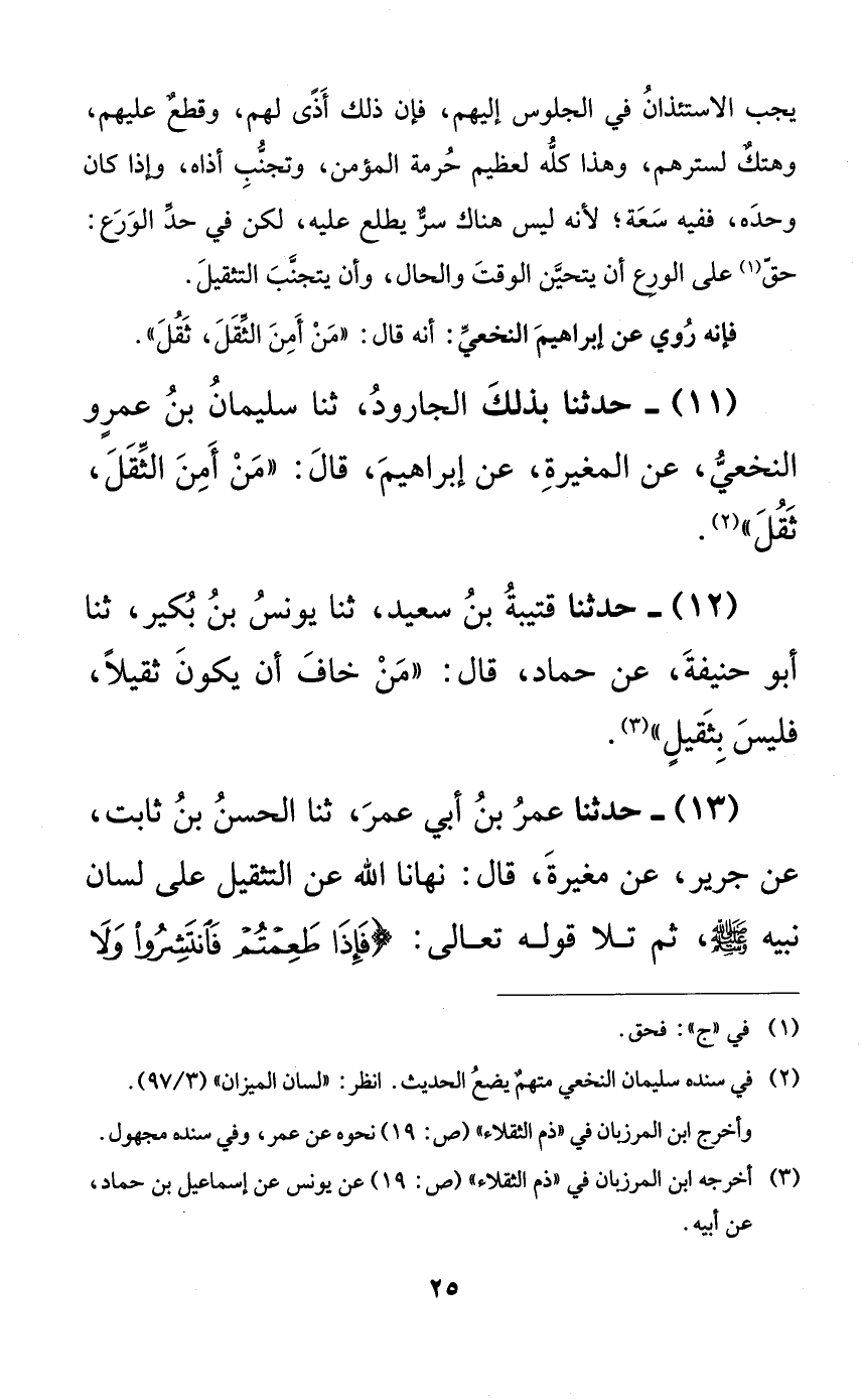 13 - حدثنا عمر بن أبي عمر، ثنا الحسن بن ثابت، عن جرير، عن مغيرة، قال: نهانا الله عن التثقيل على لسان نبيه صلى الله عليه وسلم، ثم تلا قوله تعالى: {فإذا طعمتم فانتشروا ولا