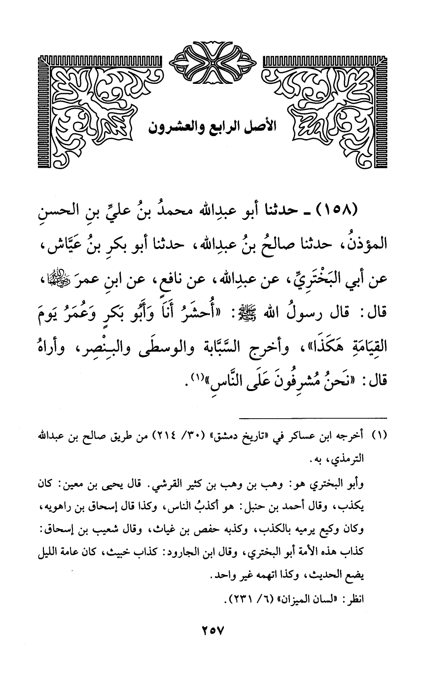 158 - حدثنا أبو عبد الله محمد بن علي بن الحسن المؤذن، حدثنا صالح بن عبد الله، حدثنا أبو بكر بن عياش، عن أبي البختري، عن عبد الله، عن نافعٍ، عن ابن عمر رضي الله عنهما، قال: قال رسول الله صلى الله عليه وسلم: ((أحشر أنا وأبو بكرٍ وعمر يوم القيامة هكذا))، وأخرج السبابة والوسطى والبنصر، وأراه قال: ((نحن مشرفون على الناس)).