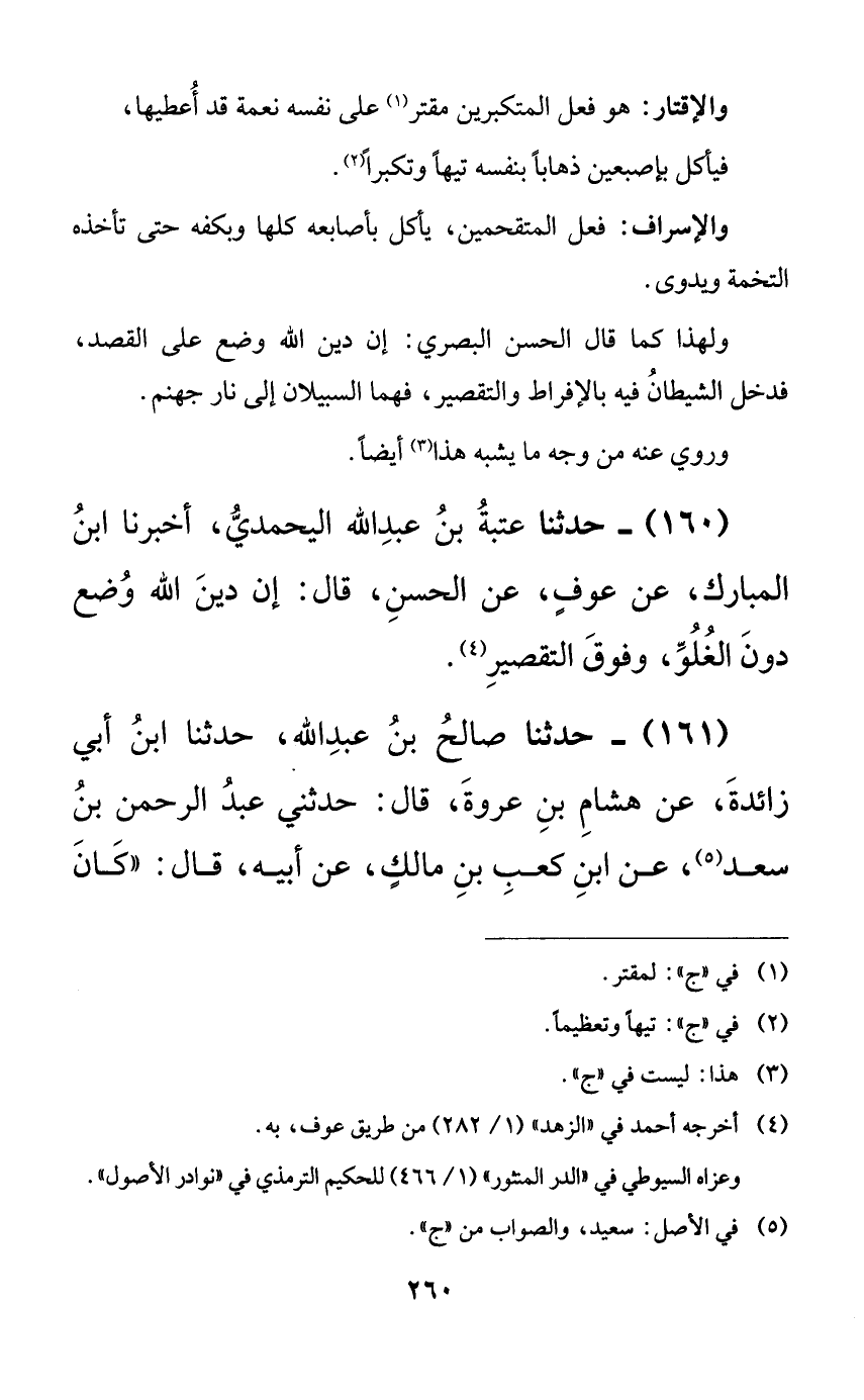 160 - حدثنا عتبة بن عبد الله اليحمدي، أخبرنا ابن المبارك، عن عوفٍ، عن الحسن، قال: إن دين الله وضع دون الغلو، وفوق التقصير.