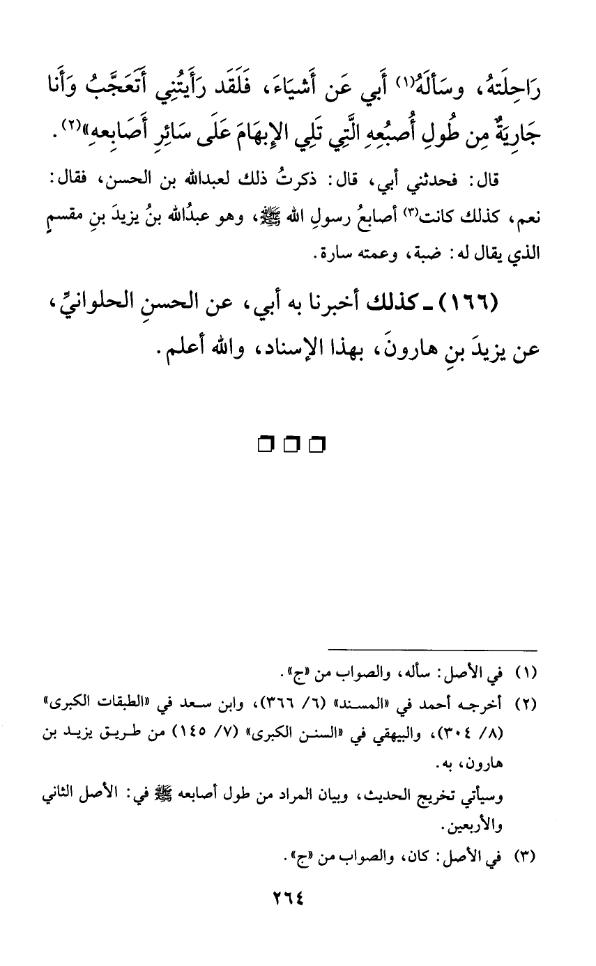 قال: فحدثني أبي، قال: ذكرت ذلك لعبد الله بن الحسن، فقال: نعم، كذلك كانت أصابع رسول الله صلى الله عليه وسلم، وهو عبد الله بن يزيد بن مقسمٍ الذي يقال له: ضبة، وعمته سارة.