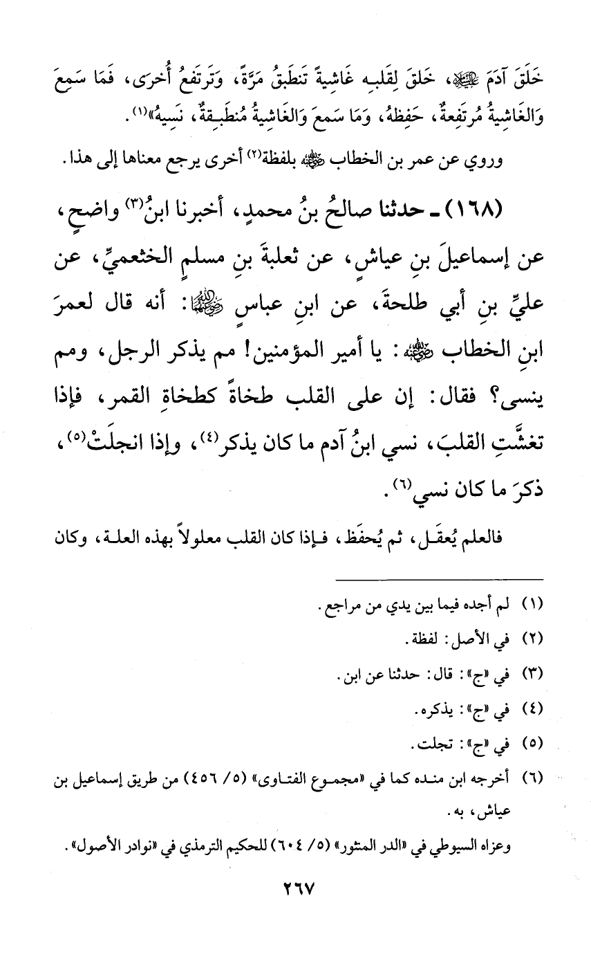 168 - حدثنا صالح بن محمدٍ، أخبرنا ابن واضحٍ، عن إسماعيل بن عياشٍ، عن ثعلبة بن مسلمٍ الخثعمي، عن عليٍّ بن أبي طلحة، عن ابن عباسٍ رضي الله عنهما: أنه قال لعمر ابن الخطاب رضي الله عنه: يا أمير المؤمنين! مم يذكر الرجل، ومم ينسى؟ فقال: إن على القلب طخاةً كطخاة القمر، فإذا تغشت القلب، نسي ابن آدم ما كان يذكر، وإذا انجلت، ذكر ما كان نسي.