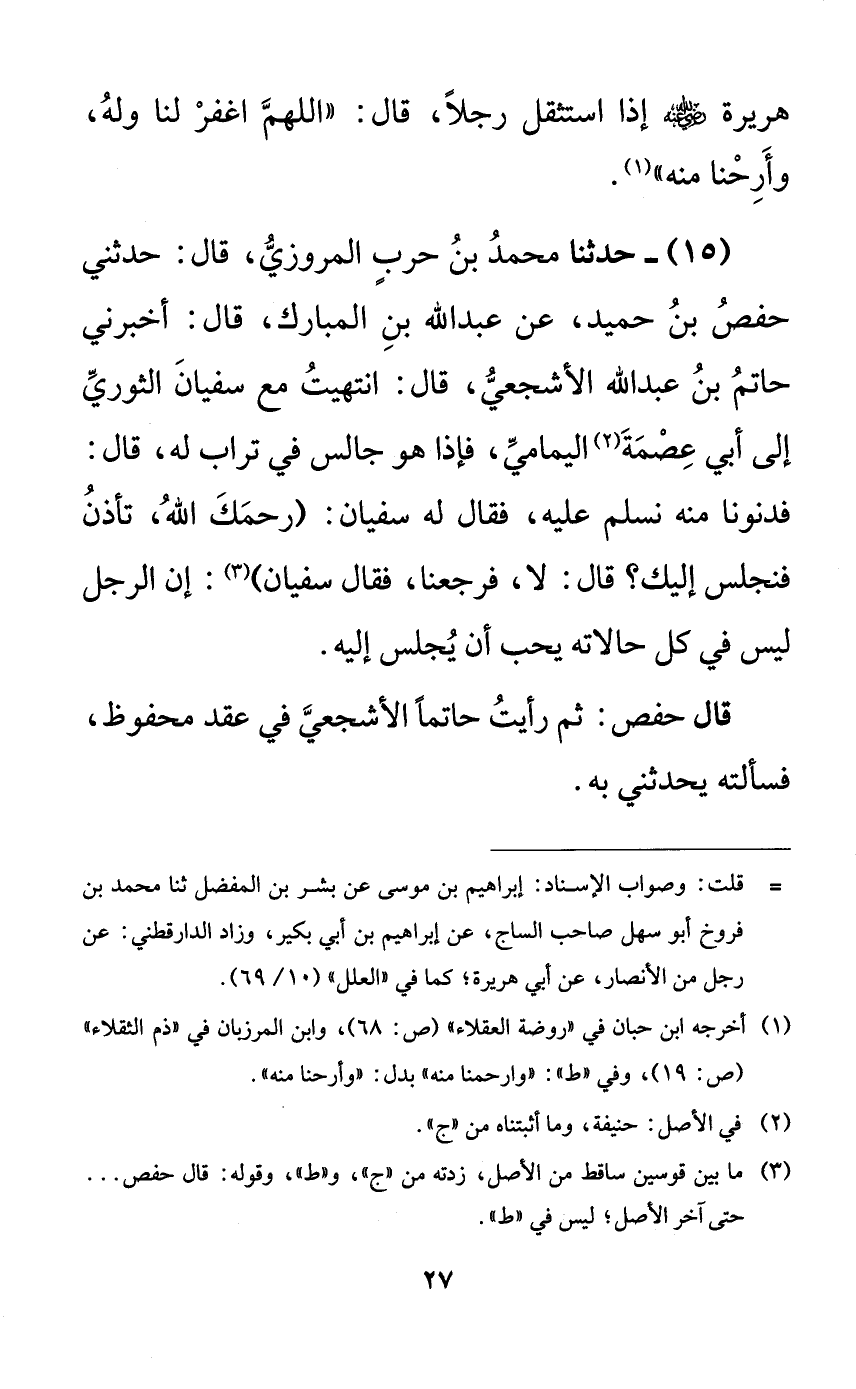 15 - حدثنا محمد بن حربٍ المروزي، قال: حدثني حفص بن حميد، عن عبد الله بن المبارك، قال: أخبرني حاتم بن عبد الله الأشجعي، قال: انتهيت مع سفيان الثوري إلى أبي عصمة اليمامي، فإذا هو جالس في تراب له، قال: فدنونا منه نسلم عليه، فقال له سفيان: (رحمك الله، تأذن فنجلس إليك؟ قال: لا، فرجعنا، فقال سفيان): إن الرجل ليس في كل حالاته يحب أن يجلس إليه.