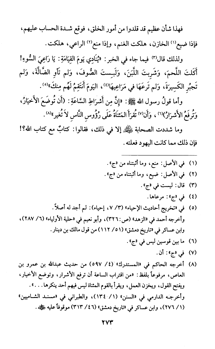 ولذلك قال فيما جاء في الخبر: ((ينادي يوم القيامة: يا راعي السوء! أكلت اللحم، وشربت اللبن، ولبست الصوف، ولم تأو الضالة، ولم تجبر الكسيرة، ولم ترعها في مراعيها، اليوم أنتقم لهم منك)).