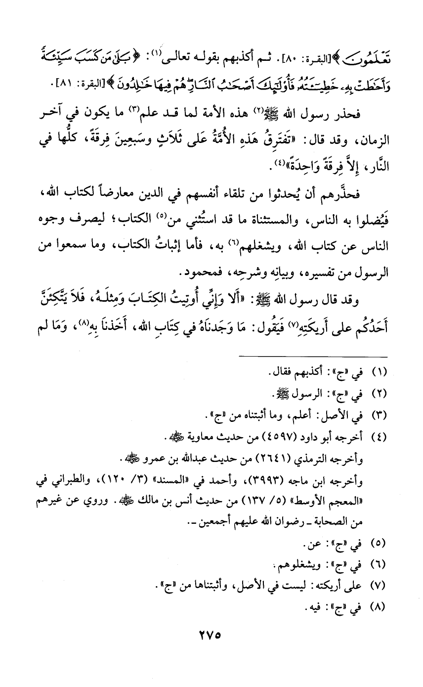 فحذر رسول الله صلى الله عليه وسلم هذه الأمة لما قد علم ما يكون في آخر الزمان، وقد قال: ((تفترق هذه الأمة على ثلاثٍ وسبعين فرقةً، كلها في النار، إلا فرقةً واحدةً)).