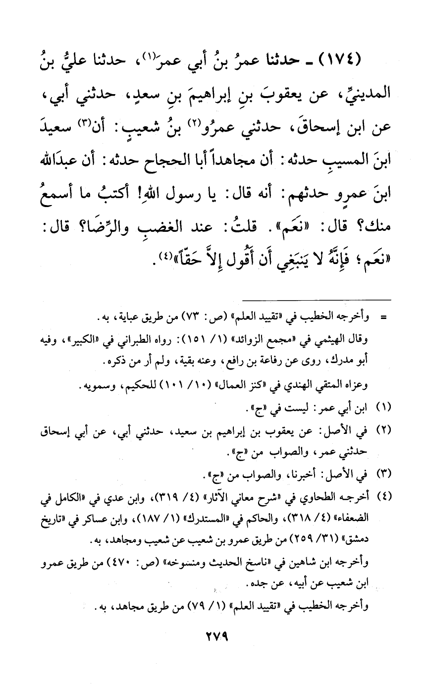 174 - حدثنا عمر بن أبي عمر، حدثنا علي بن المديني، عن يعقوب بن إبراهيم بن سعدٍ، حدثني أبي، عن ابن إسحاق، حدثني عمرو بن شعيبٍ: أن سعيد ابن المسيب حدثه: أن مجاهداً أبا الحجاج حدثه: أن عبد الله ابن عمرٍو حدثهم: أنه قال: يا رسول الله! أكتب ما أسمع منك؟ قال: ((نعم)). قلت: عند الغضب والرضا؟ قال: ((نعم؛ فإنه لا ينبغي أن أقول إلا حقًّا)).