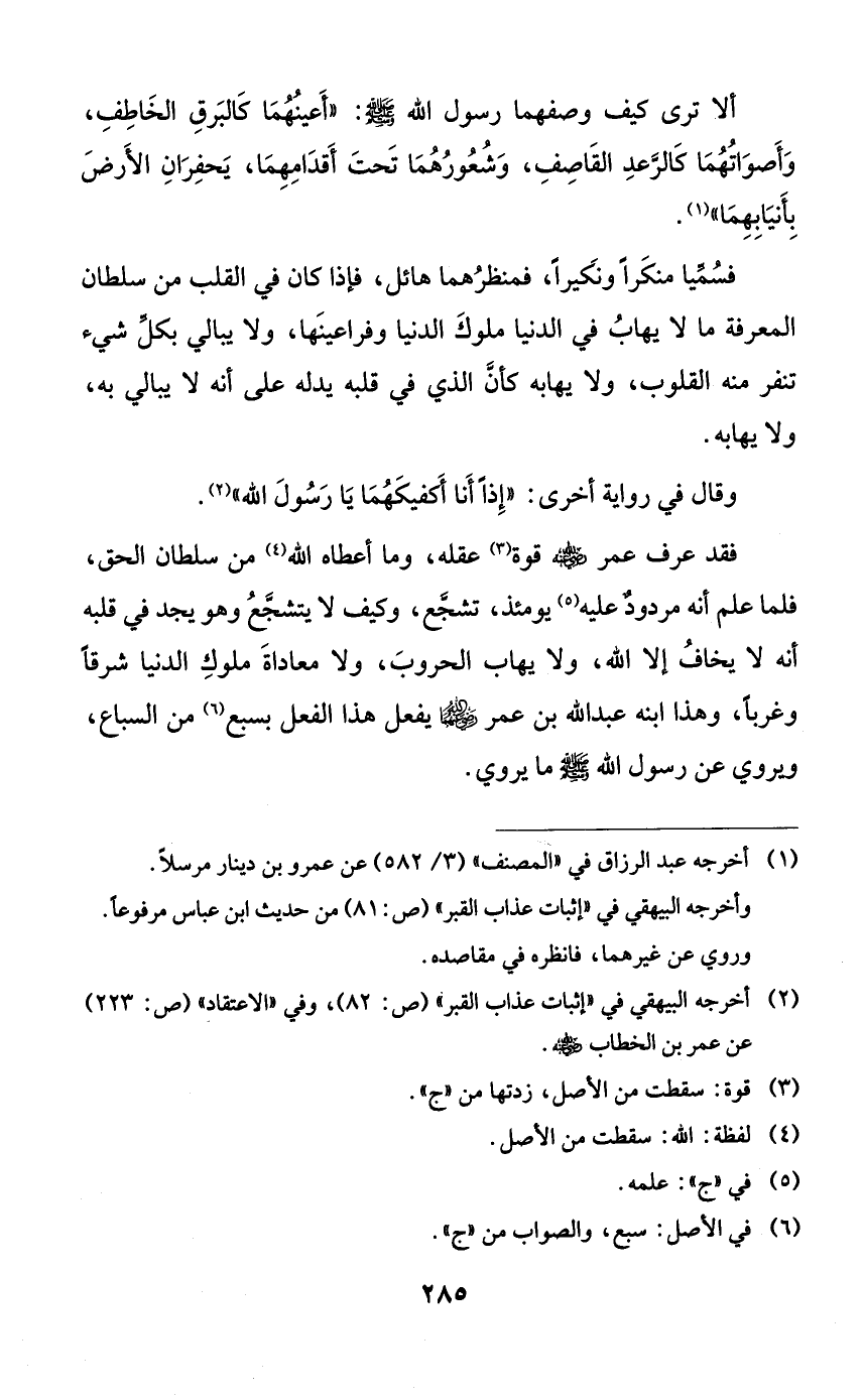 فسميا منكراً ونكيراً، فمنظرهما هائل، فإذا كان في القلب من سلطان المعرفة ما لا يهاب في الدنيا ملوك الدنيا وفراعينها، ولا يبالي بكل شيء تنفر منه القلوب، ولا يهابه كأن الذي في قلبه يدله على أنه لا يبالي به، ولا يهابه.
