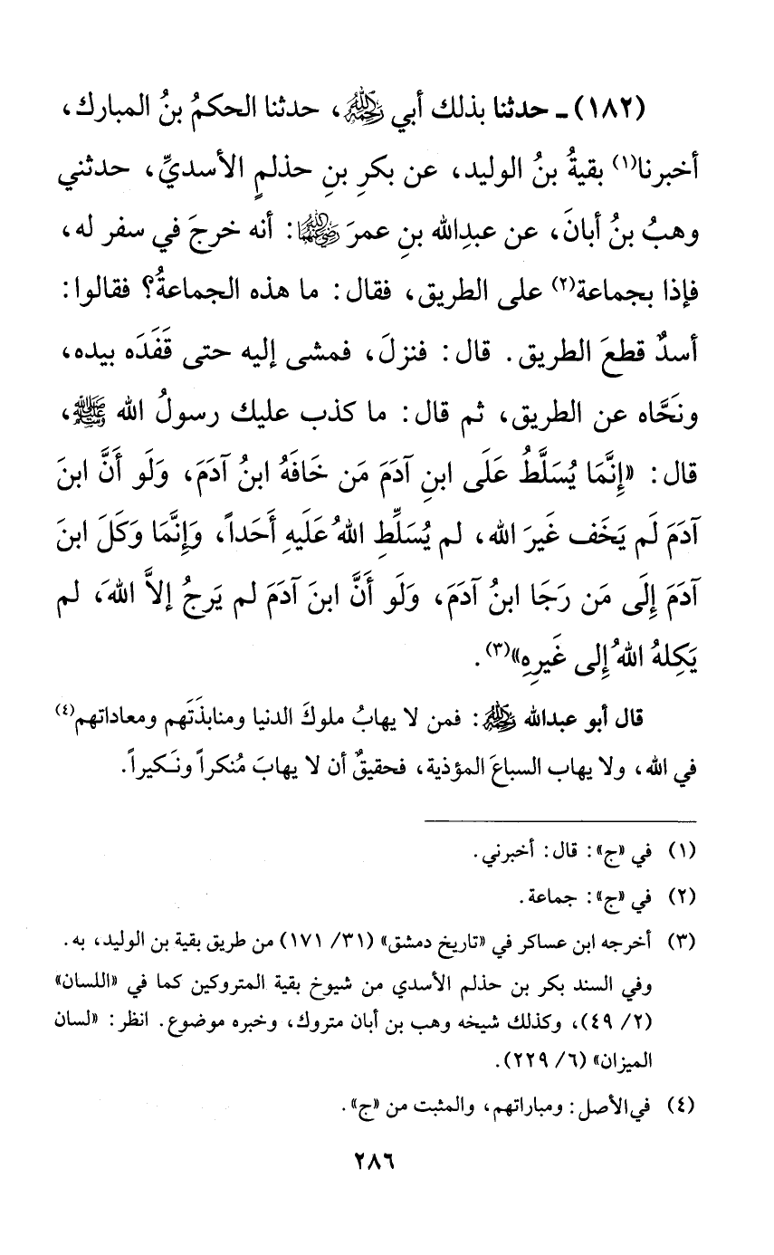 182 - حدثنا بذلك أبي رحمه الله، حدثنا الحكم بن المبارك، أخبرنا بقية بن الوليد، عن بكرٍ بن حذلمٍ الأسدي، حدثني وهب بن أبان، عن عبد الله بن عمر رضي الله عنهما: أنه خرج في سفر له، فإذا بجماعة على الطريق، فقال: ما هذه الجماعة؟ فقالوا: أسدٌ قطع الطريق. قال: فنزل، فمشى إليه حتى قفده بيده، ونحاه عن الطريق، ثم قال: ما كذب عليك رسول الله صلى الله عليه وسلم، قال: ((إنما يسلط على ابن آدم من خافه ابن آدم، ولو أن ابن آدم لم يخف غير الله، لم يسلط الله عليه أحداً، وإنما وكل ابن آدم إلى من رجا ابن آدم، ولو أن ابن آدم لم يرج إلا الله، لم يكله الله إلى غيره)).