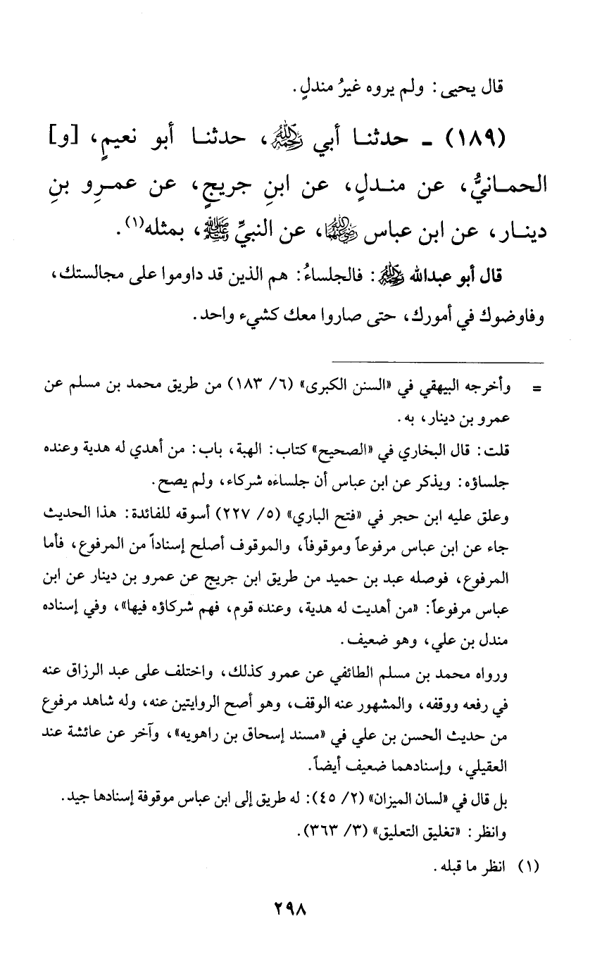 189 - حدثنا أبي رحمه الله، حدثنا أبو نعيم، [و] الحماني، عن مندلٍ، عن ابن جريجٍ، عن عمرو بن دينار، عن ابن عباس رضي الله عنهما، عن النبي صلى الله عليه وسلم، بمثله.