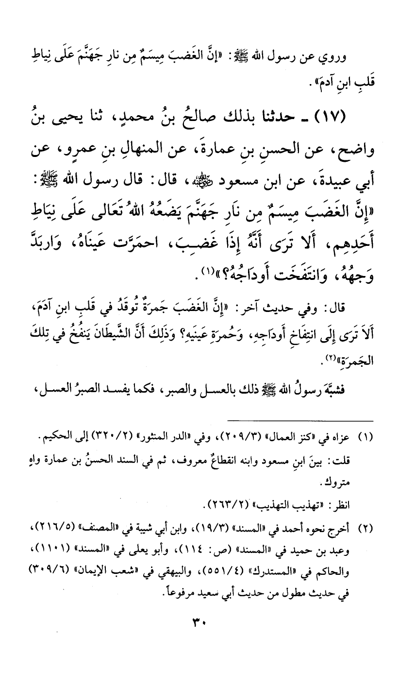 17 - حدثنا بذلك صالح بن محمدٍ، ثنا يحيى بن واضح، عن الحسن بن عمارة، عن المنهال بن عمروٍ، عن أبي عبيدة، عن ابن مسعود رضي الله عنه، قال: قال رسول الله صلى الله عليه وسلم: ((إن الغضب ميسمٌ من نار جهنم يضعه الله تعالى على نياط أحدهم، ألا ترى أنه إذا غضب، احمرت عيناه، واربد وجهه، وانتفخت أوداجه؟)).
