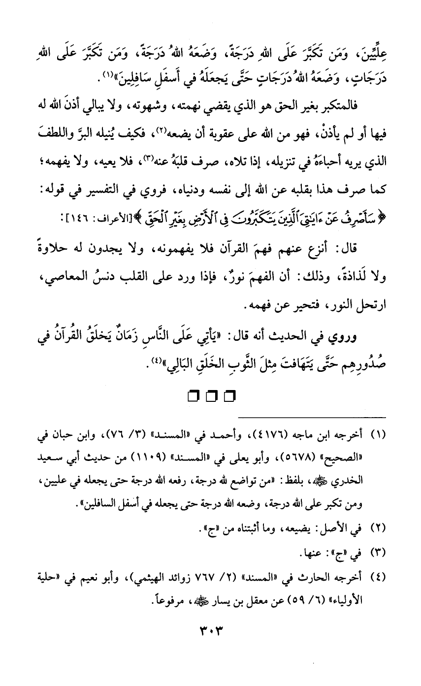 فالمتكبر بغير الحق هو الذي يقضي نهمته، وشهوته ولا يبالي أذن الله له فيها أو لم يأذن، فهو من الله على عقوبة أن يضعه، فكيف ينيله البر واللطف الذي يريه أحباءه في تنزيله، إذا تلاه، صرف قلبه عنه، فلا يعيه، ولا يفهمه؛ كما صرف هذا بقلبه عن الله إلى نفسه ودنياه، فروي في التفسير في قوله: {سأصرف عن آياتي الذين يتكبرون في الأرض بغير الحق}: