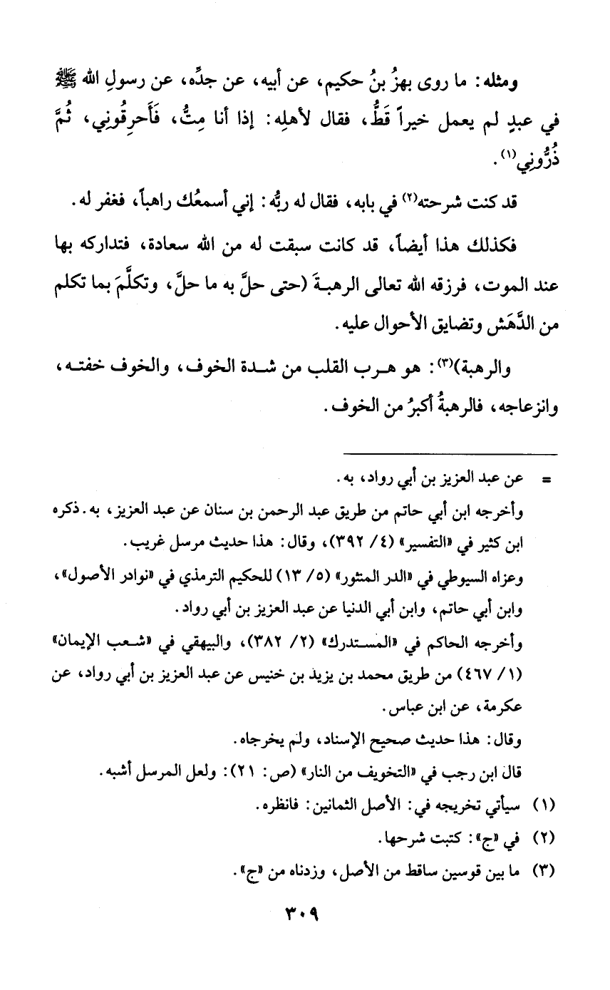 ومثله: ما روى بهز بن حكيم، عن أبيه، عن جده، عن رسول الله صلى الله عليه وسلم في عبدٍ لم يعمل خيراً قط، فقال لأهله: إذا أنا مت، فأحرقوني، ثم ذروني.
