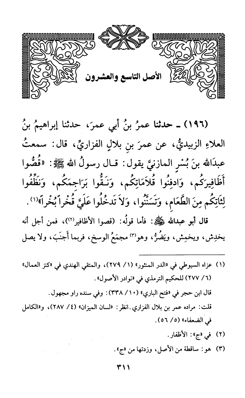 196 - حدثنا عمر بن أبي عمر، حدثنا إبراهيم بن العلاء الزبيدي، عن عمر بن بلالٍ الفزاري، قال: سمعت عبد الله بن بسرٍ المازني يقول: قال رسول الله صلى الله عليه وسلم: ((قصوا أظافيركم، وادفنوا قلاماتكم، ونقوا براجمكم، ونظفوا لثاتكم من الطعام، وتسننوا، ولا تدخلوا علي قخراً بخراً)).