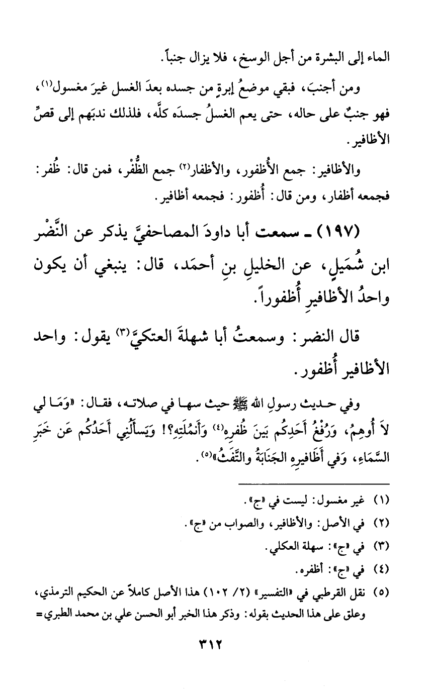 197 - سمعت أبا داود المصاحفي يذكر عن النضر ابن شميلٍ، عن الخليل بن أحمد، قال: ينبغي أن يكون واحد الأظافير أظفوراً.