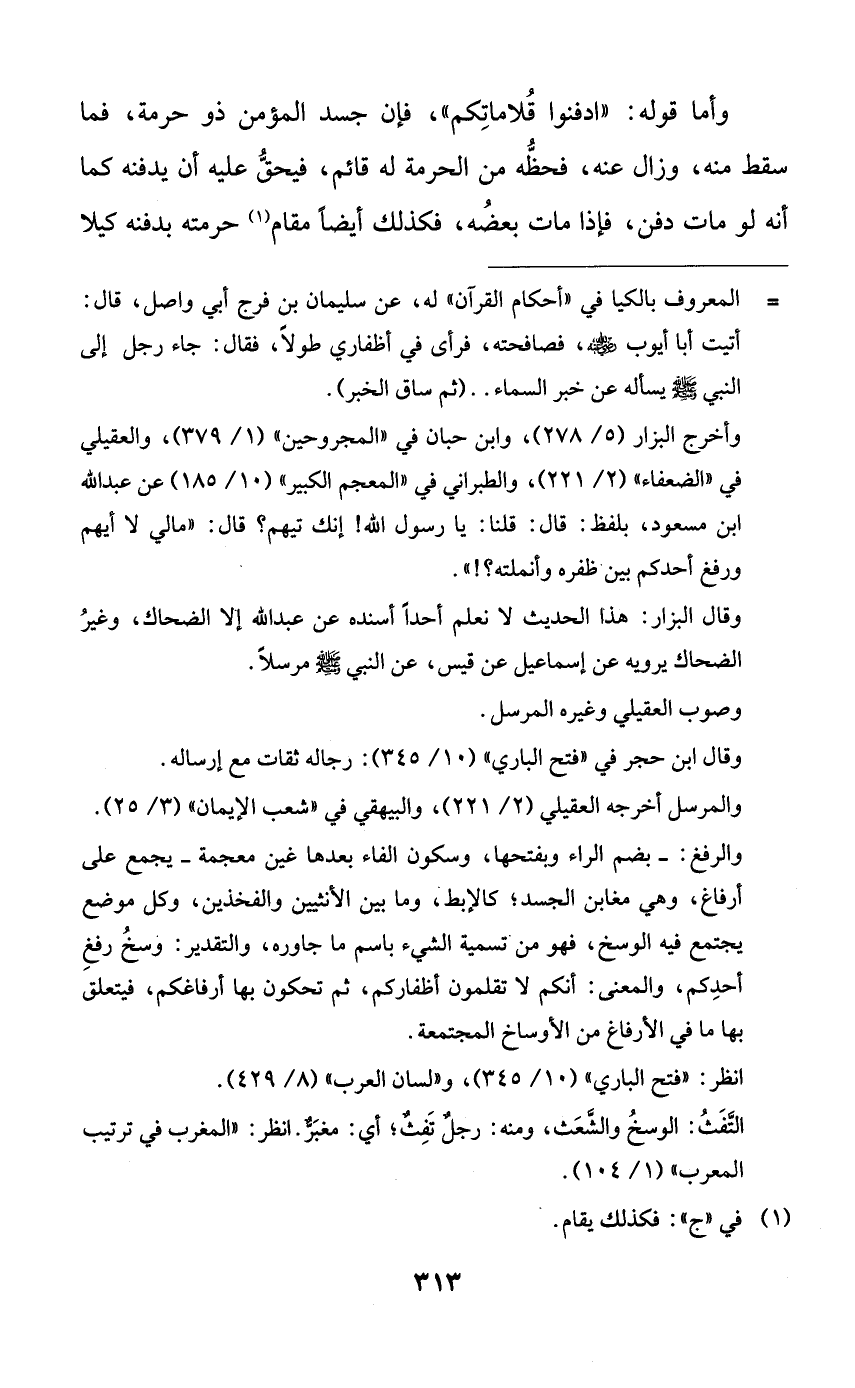 وأما قوله: ((ادفنوا قلاماتكم))، فإن جسد المؤمن ذو حرمة، فما سقط منه، وزال عنه، فحظه من الحرمة له قائم، فيحق عليه أن يدفنه كما أنه لو مات دفن، فإذا مات بعضه، فكذلك أيضاً مقام حرمته بدفنه كيلا