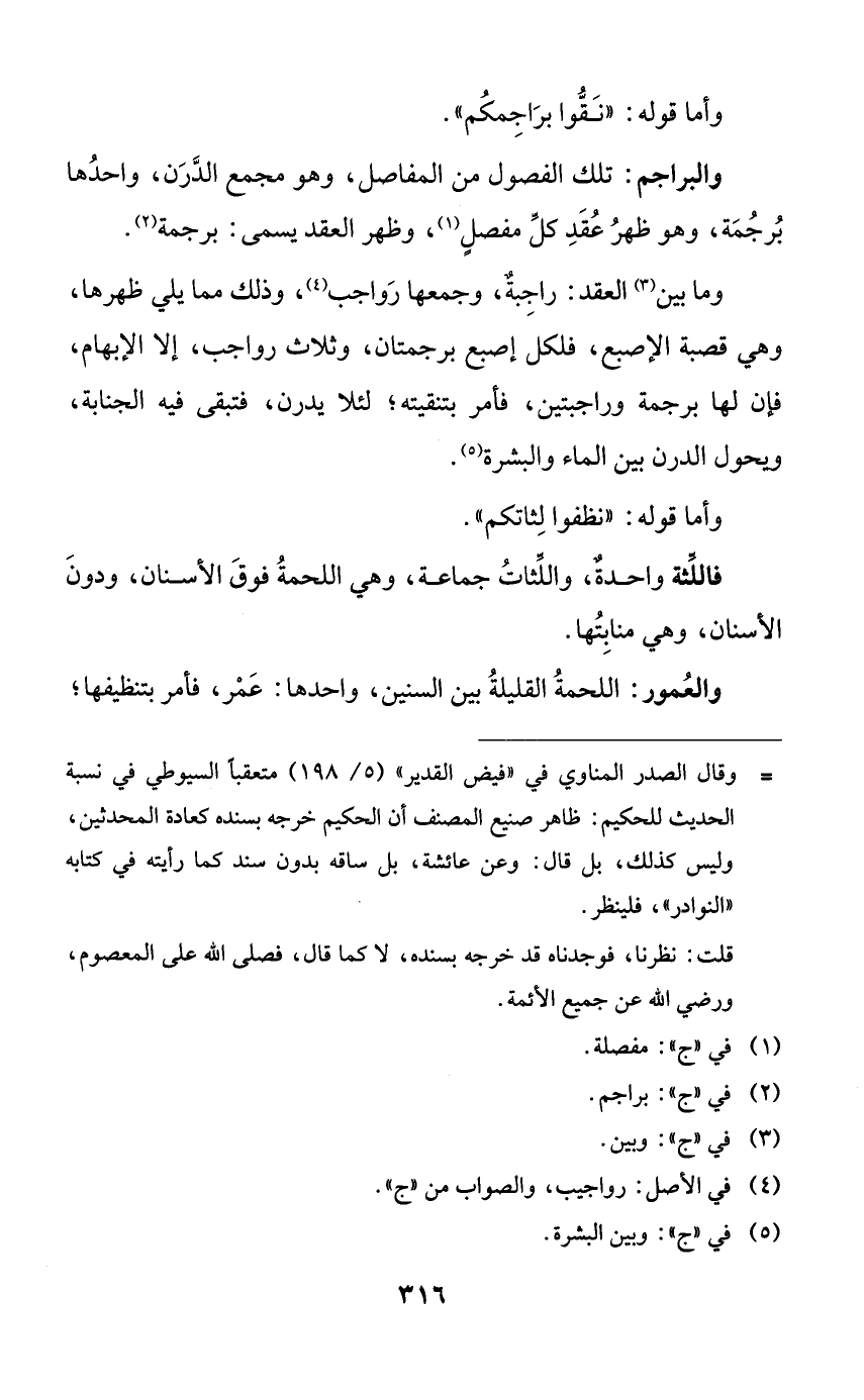 وما بين العقد: راجبةٌ، وجمعها رواجب، وذلك مما يلي ظهرها، وهي قصبة الإصبع، فلكل إصبع برجمتان، وثلاث رواجب، إلا الإبهام، فإن لها برجمة وراجبتين، فأمر بتنقيته؛ لئلا يدرن، فتبقى فيه الجنابة، ويحول الدرن بين الماء والبشرة.