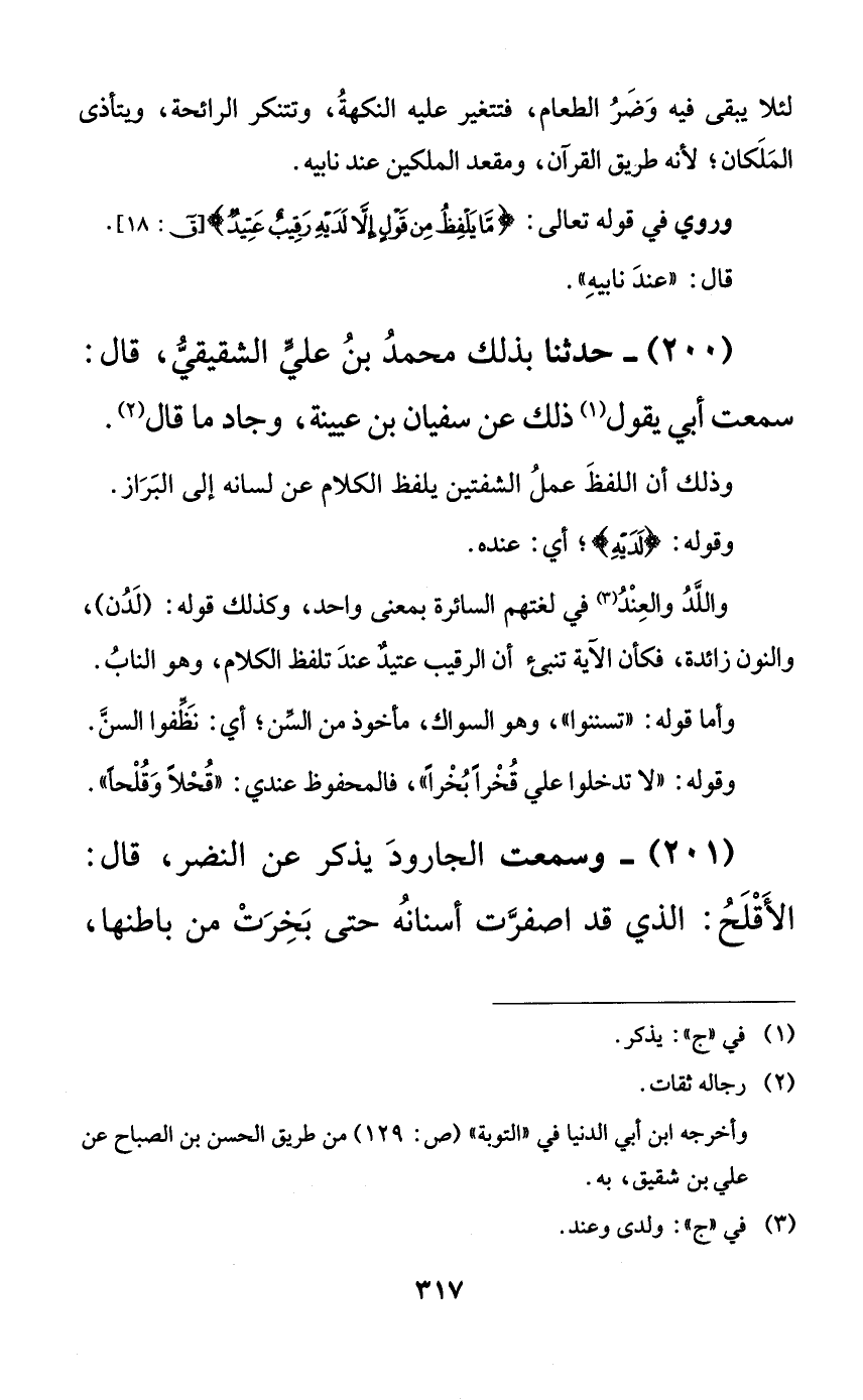 200 - حدثنا بذلك محمد بن علي الشقيقي، قال: سمعت أبي يقول ذلك عن سفيان بن عيينة، وجاد ما قال.