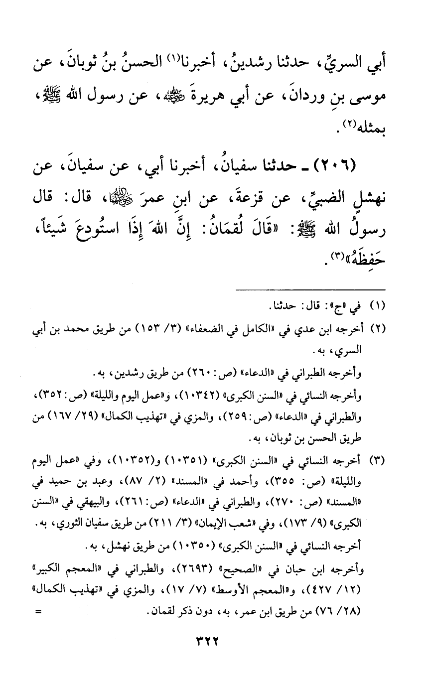 206 - حدثنا سفيان، أخبرنا أبي، عن سفيان، عن نهشلٍ الضبي، عن قزعة، عن ابن عمر رضي الله عنهما، قال: قال رسول الله صلى الله عليه وسلم: ((قال لقمان: إن الله إذا استودع شيئاً، حفظه)).