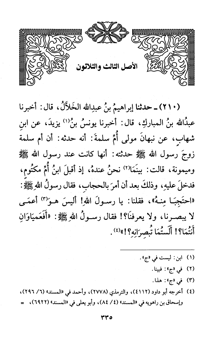 210 - حدثنا إبراهيم بن عبد الله الخلال، قال: أخبرنا عبد الله بن المبارك، قال: أخبرنا يونس بن يزيد، عن ابن شهابٍ، عن نبهان مولى أم سلمة: أنه حدثه: أن أم سلمة زوج رسول الله صلى الله عليه وسلم حدثته: أنها كانت عند رسول الله صلى الله عليه وسلم وميمونة، قالت: بينما نحن عنده، إذ أقبل ابن أم مكتومٍ، فدخل عليه، وذلك بعد أن أمر بالحجاب، فقال رسول الله صلى الله عليه وسلم: ((احتجبا منه))، فقلنا: يا رسول الله! أليس هو أعمى لا يبصرنا، ولا يعرفنا؟! فقال رسول الله صلى الله عليه وسلم: ((أفعمياوان أنتما؟! ألستما تبصرانه؟!)).
