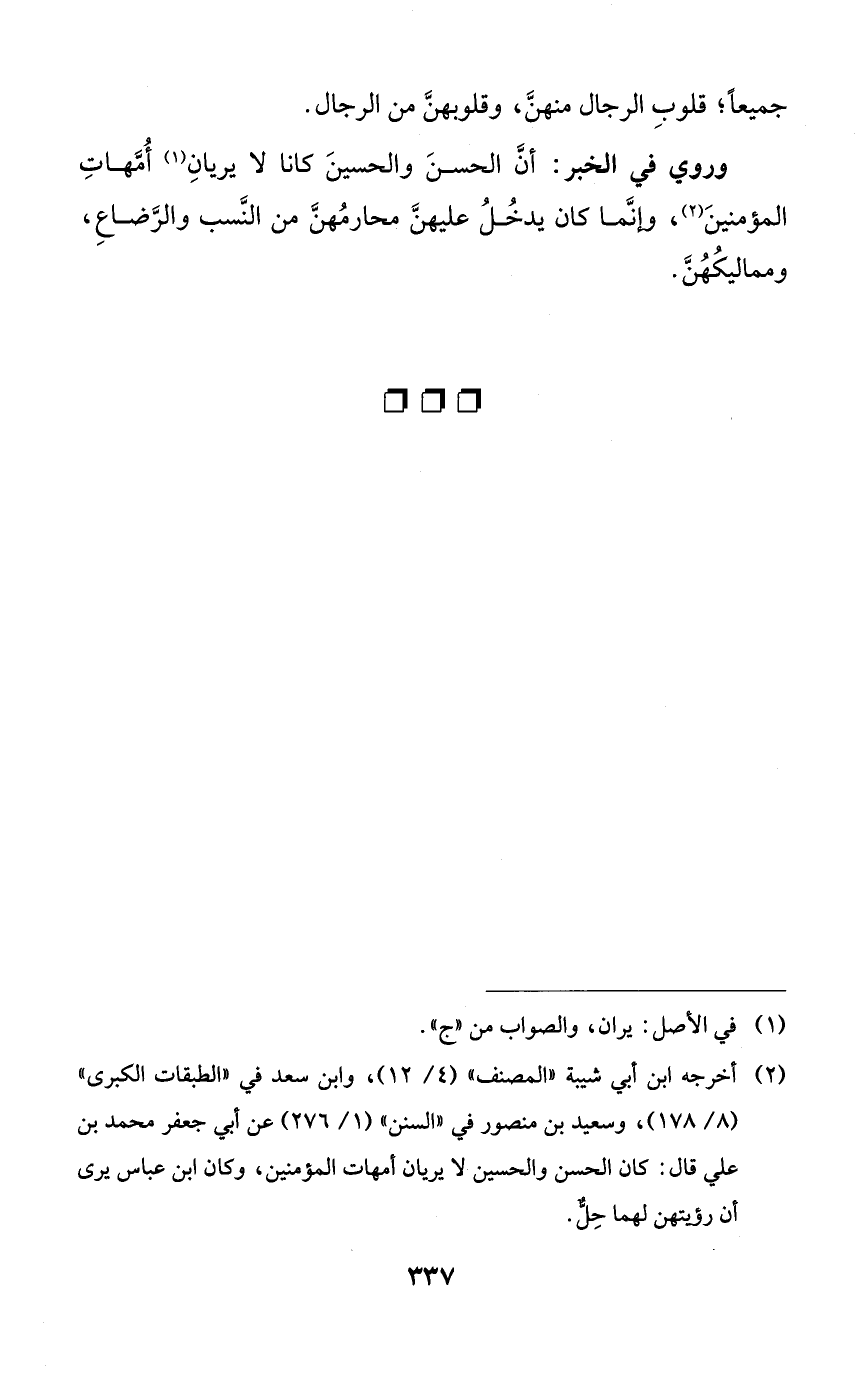 وروي في الخبر: أن الحسن والحسين كانا لا يريان أمهات المؤمنين، وإنما كان يدخل عليهن محارمهن من النسب والرضاع، ومماليكهن.
