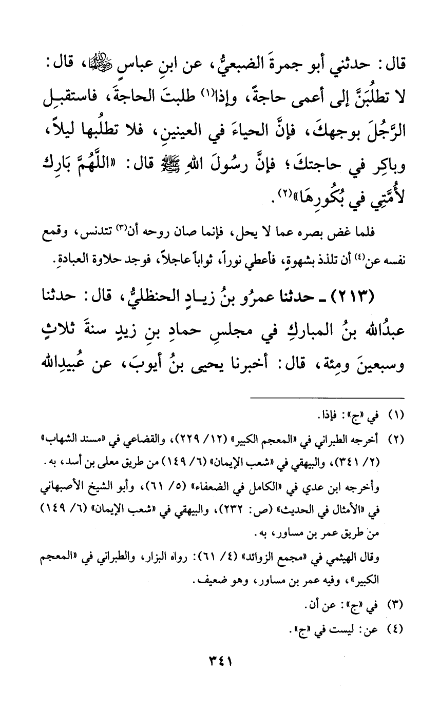 قال: حدثني أبو جمرة الضبعي، عن ابن عباسٍ رضي الله عنهما، قال: لا تطلبن إلى أعمى حاجةً، وإذا طلبت الحاجة، فاستقبل الرجل بوجهك، فإن الحياء في العينين، فلا تطلبها ليلاً، وباكر في حاجتك؛ فإن رسول الله صلى الله عليه وسلم قال: ((اللهم بارك لأمتي في بكورها)).
