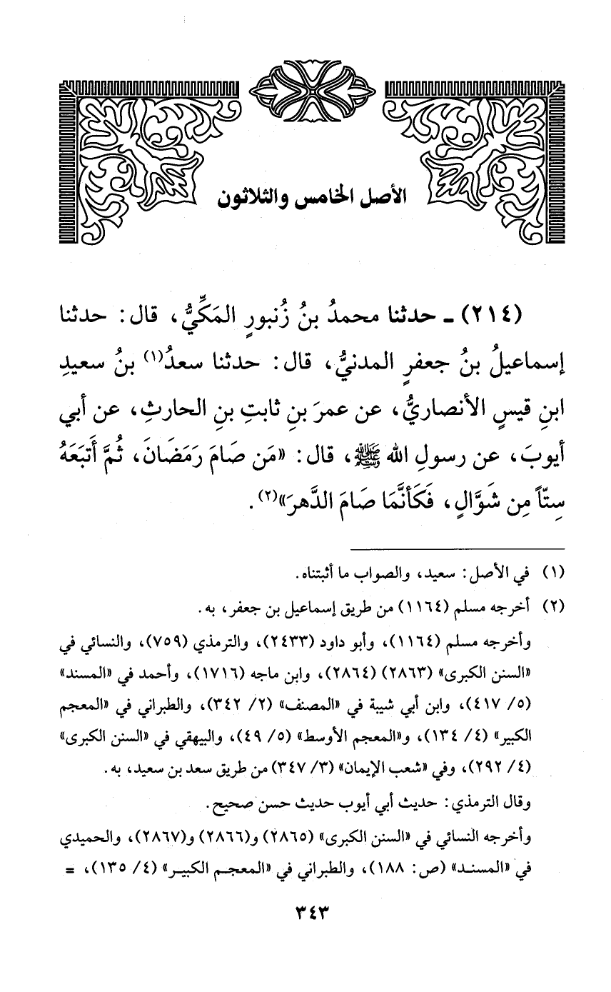 214 - حدثنا محمد بن زنبورٍ المكي، قال: حدثنا إسماعيل بن جعفرٍ المدني، قال: حدثنا سعد بن سعيد ابن قيسٍ الأنصاري، عن عمر بن ثابت بن الحارث، عن أبي أيوب، عن رسول الله صلى الله عليه وسلم، قال: ((من صام رمضان، ثم أتبعه ستًّا من شوالٍ، فكأنما صام الدهر)).
