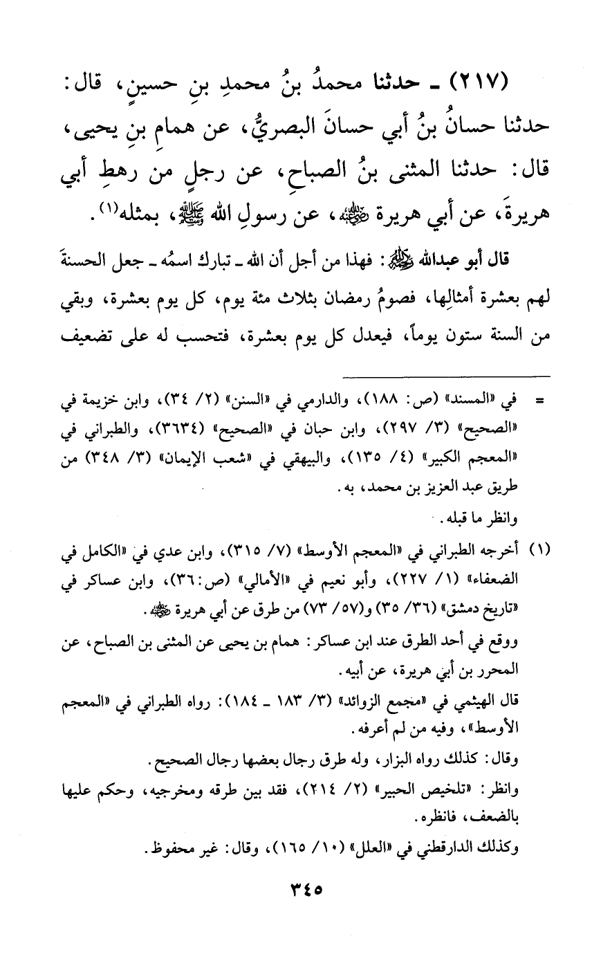 217 - حدثنا محمد بن محمد بن حسينٍ، قال: حدثنا حسان بن أبي حسان البصري، عن همام بن يحيى، قال: حدثنا المثنى بن الصباح، عن رجلٍ من رهط أبي هريرة، عن أبي هريرة رضي الله عنه، عن رسول الله صلى الله عليه وسلم، بمثله.