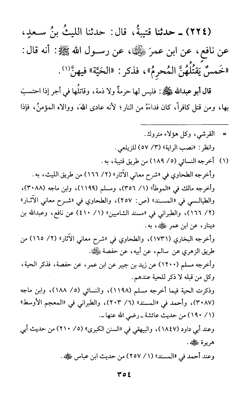 224 - حدثنا قتيبة، قال: حدثنا الليث بن سعدٍ، عن نافعٍ، عن ابن عمر رضي الله عنهما، عن رسول الله صلى الله عليه وسلم: أنه قال: ((خمسٌ يقتلهن المحرم))، فذكر: ((الحية)) فيهن.